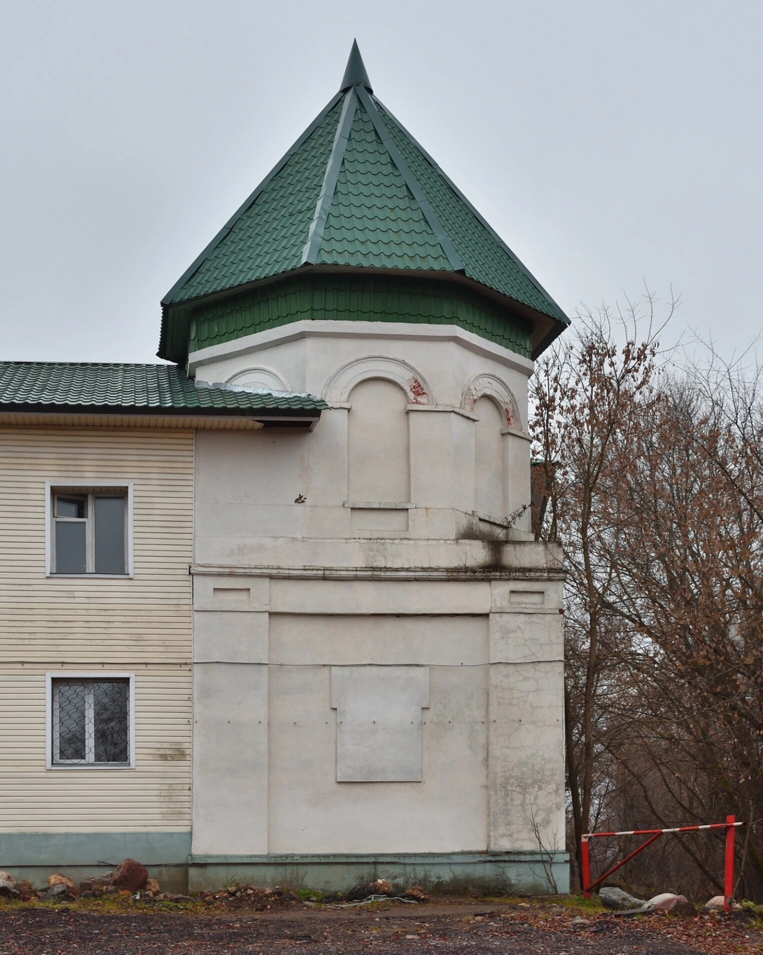 На снимке хорошо просматривается центральный объём – башня, увенчанная шатровой крышей, покрытой зелёным кровельным материалом. Стены башни оштукатурены и выкрашены в светлый тон. В её верхней части видны три арочных проёма, ныне заложенных, с сохранившимися фрагментами красной отделки. Выше арок проходит широкий гладкий фриз. К башне слева примыкает часть корпуса, обшитая горизонтальным сайдингом кремового цвета, с двумя прямоугольными окнами, расположенными одно над другим. Крыша этого корпуса также покрыта зелёным материалом.