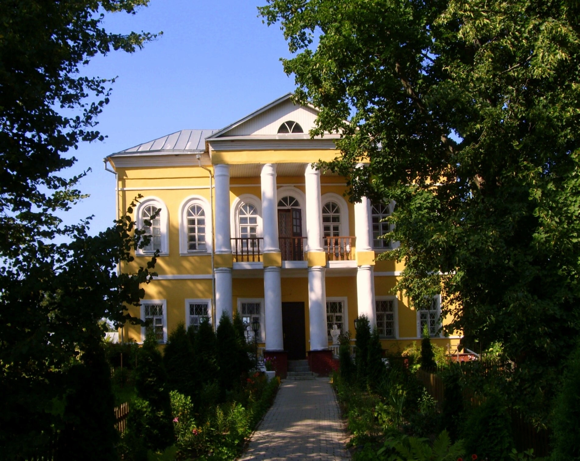 На представленной фотографии запечатлён игуменский корпус Свято-Николаевского Одрина женского монастыря, расположенного в Брянской области. Двухэтажное здание, выдержанное в канонах классического стиля, окрашено в тёплый желтый цвет и украшено белоснежными колоннами и арочными оконными проёмами. Центральный вход подчёркнут балконом на втором этаже, к которому ведёт аккуратная дорожка, обрамлённая ухоженным зелёным газоном. Высокие раскидистые деревья по бокам здания образуют живописную природную арку, создающую ощущение умиротворения и покоя, свойственного этой святой обители.