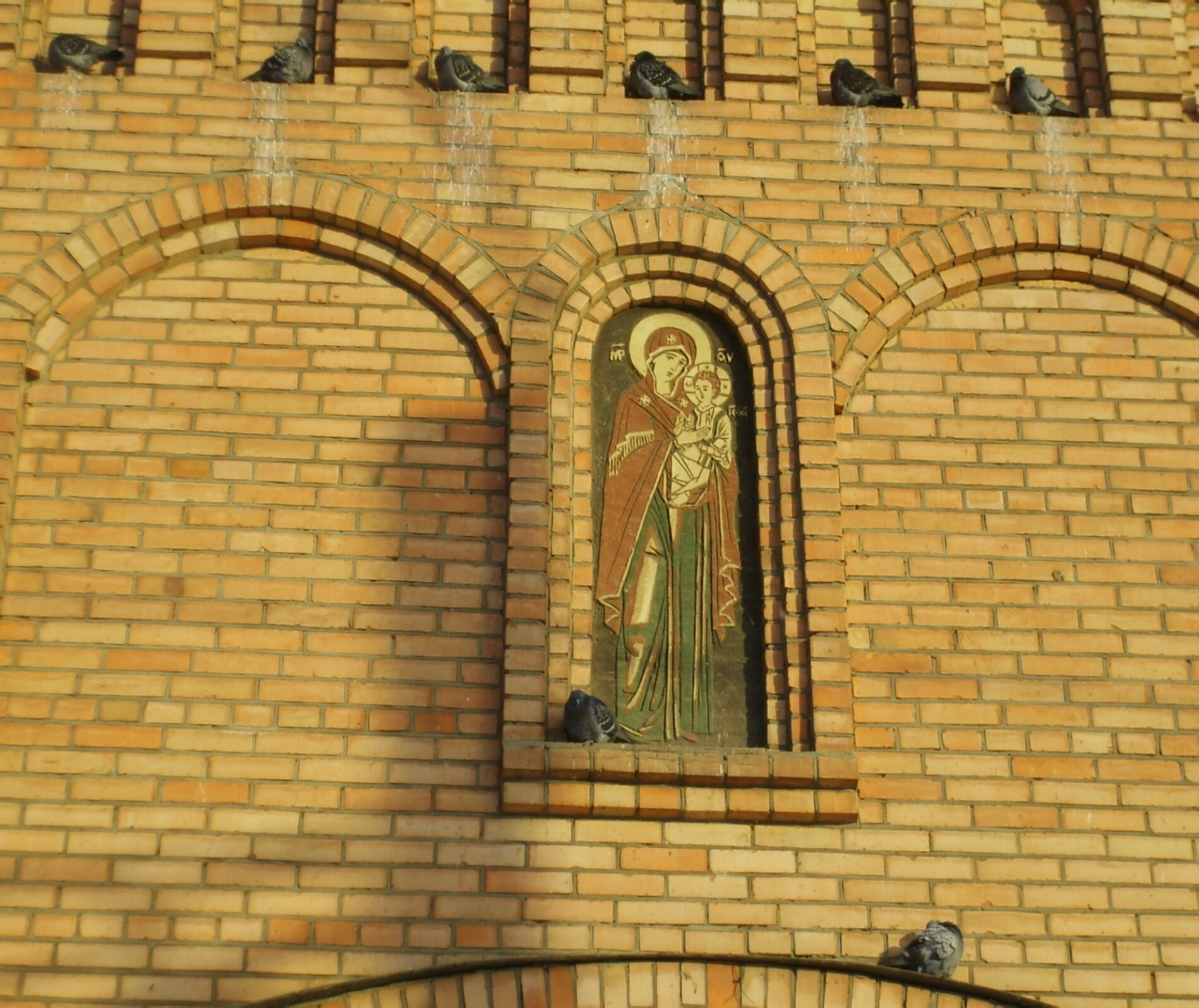 На представленной фотографии запечатлён фрагмент кирпичной стены колокольни Свято-Введенского женского монастыря, что в городе Иваново. Центральным элементом композиции является почитаемая икона Пресвятой Богородицы с Младенцем Иисусом, помещённая в киот. Образ, являющийся объектом молитвенного поклонения и духовным ориентиром для верующих, расположен на древней стене, что символизирует неразрывную связь земного и небесного.