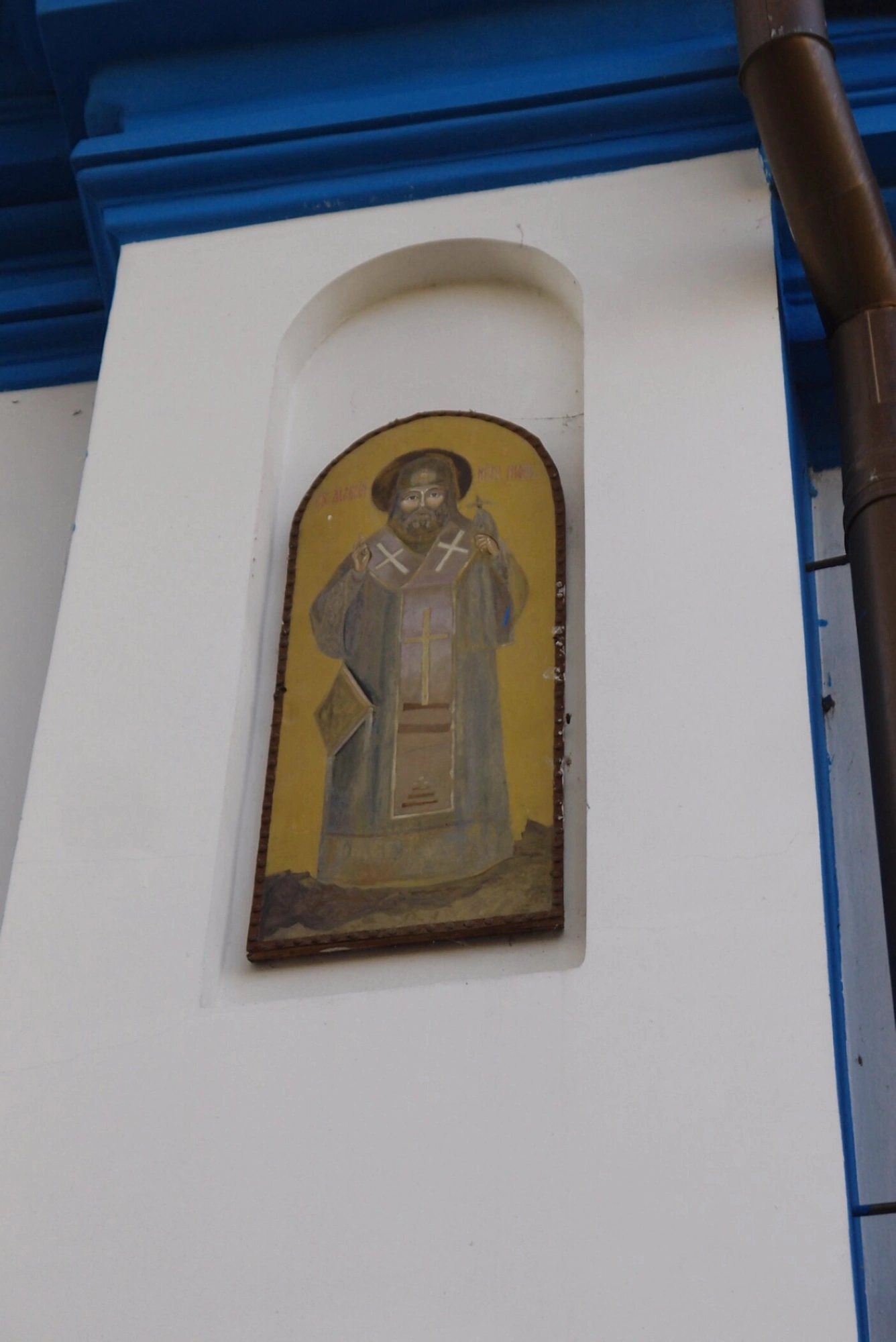 Икона изображает святого, облачённого в традиционные святительские одежды. В его деснице находится крест, символизирующий мученический подвиг или служение Господу, а в левой руке он держит Священное Писание, что указывает на его причастность к проповеди Слова Божия. По иконографическим признакам можно предположить, что на фреске представлен один из святых отцов или святителей Православной Церкви.
