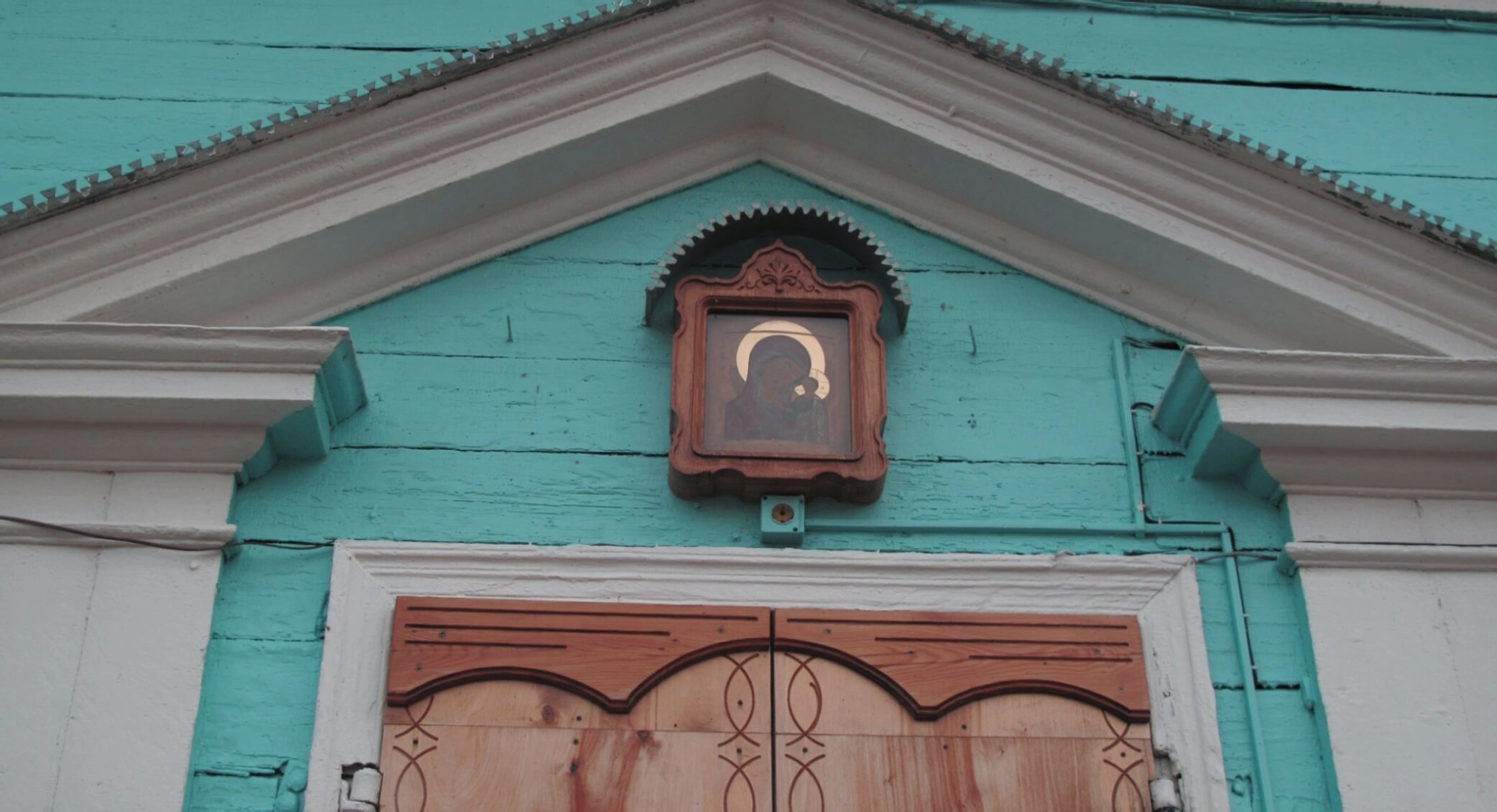 На фотографии запечатлена чтимая икона, размещённая над главным входом в Церковь Казанской иконы Божией Матери, что расположена в селе Великий Враг Кстовского района Нижегородской области. Священный образ, пребывающий в резном деревянном киоте, венчает портал храма и благословляет всех входящих под священные своды.