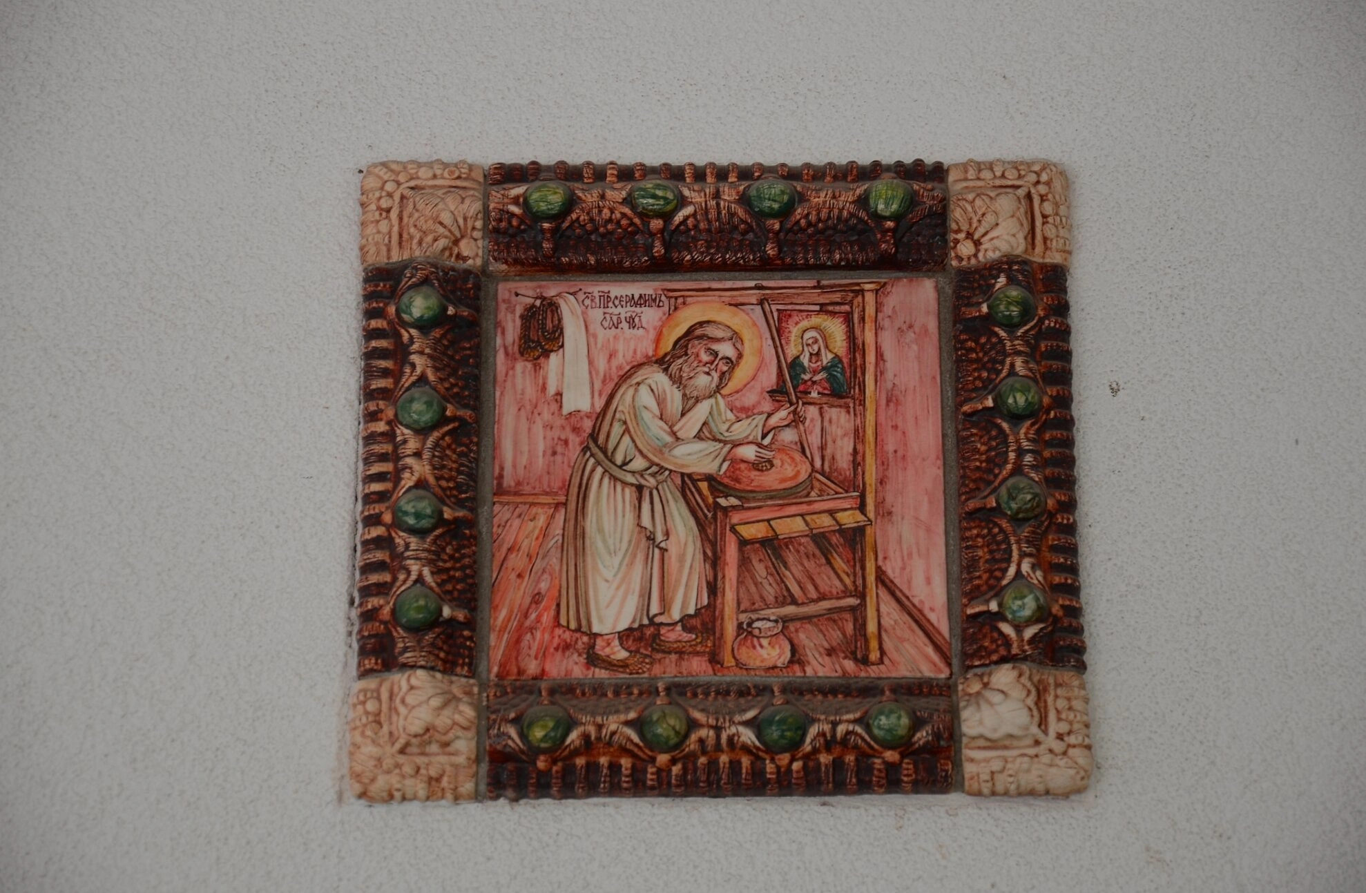 На представленной фотографии запечатлена храмовая икона преподобного Серафима Саровского, расположенная в церкви, освященной в честь этого великого русского святого в городе Анапе. Святой образ выполнен в уникальной технике на керамической плитке, что является характерной особенностью храмового убранства.
