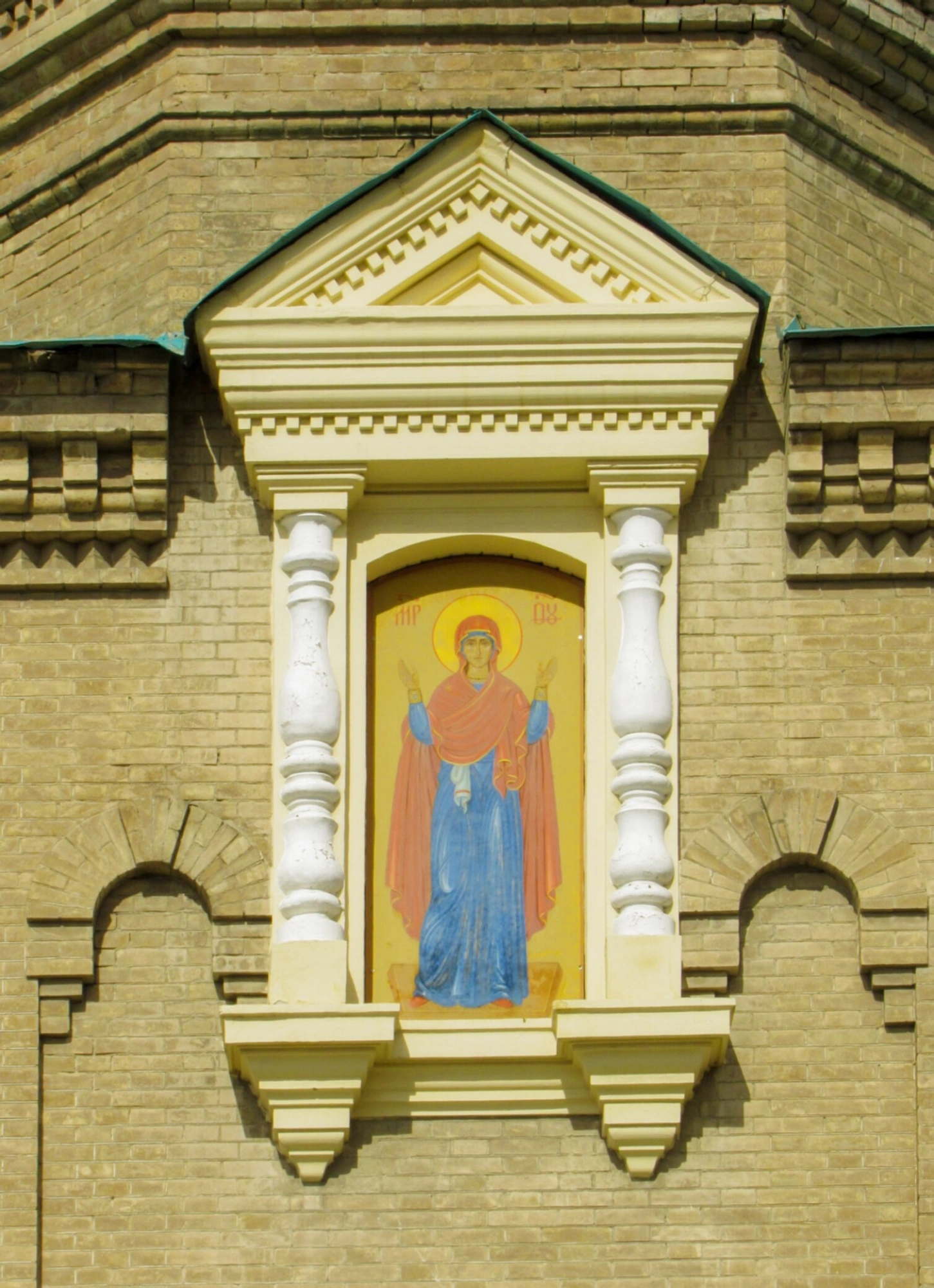 Киот с иконой вмонтирован в архитектурную нишу, обрамлённую декоративными колоннами и карнизом, выполненными в светлых тонах, что создаёт эффект возношения и выделяет священный образ на фоне кладки из жёлтого кирпича. Такое внешнее размещение икон является традиционным для православного зодчества и служит для освящения окружающего пространства и напоминания о присутствии Божием в городе.