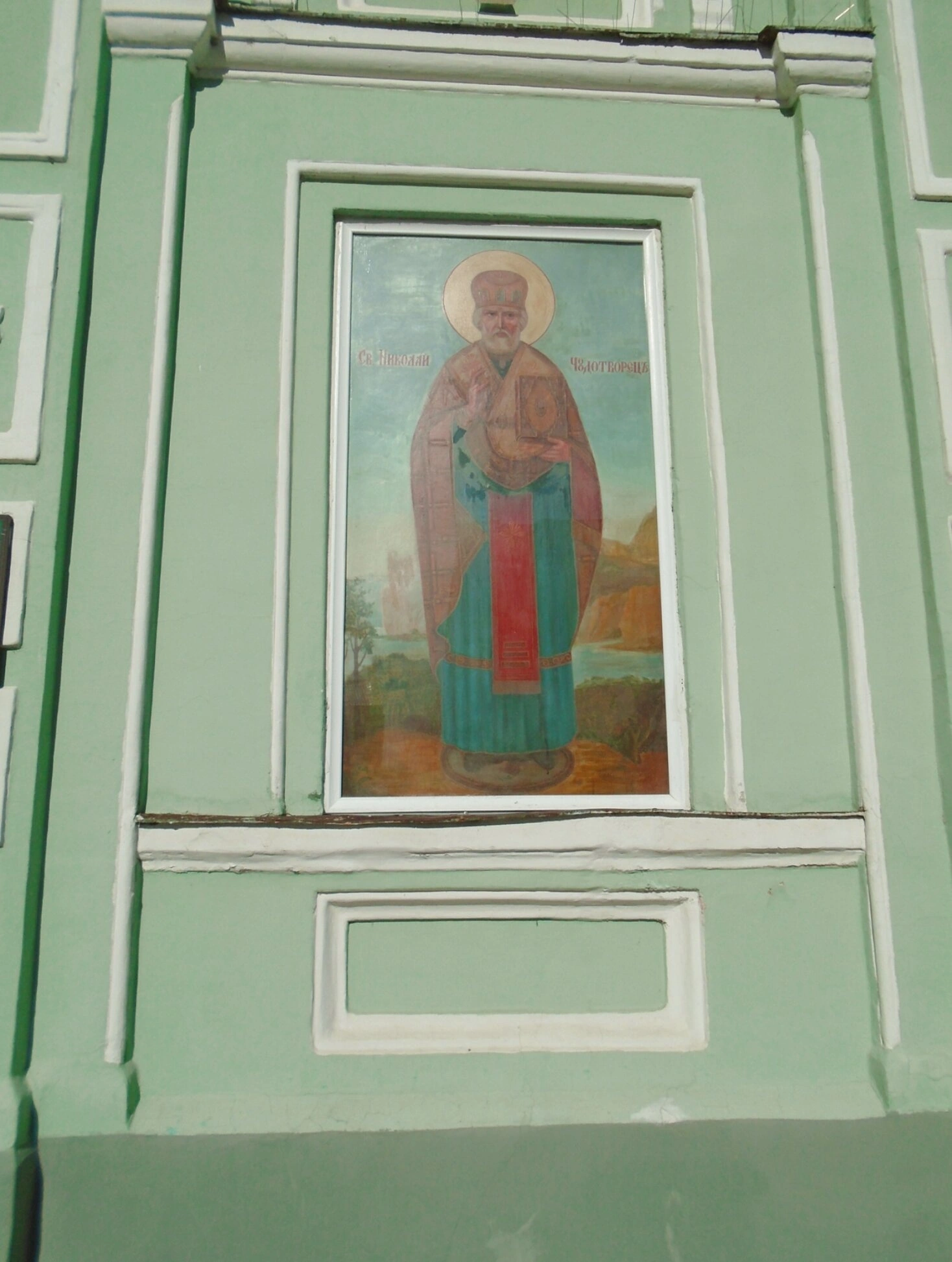 На представленной фотографии запечатлена чтимая икона святителя Николая, архиепископа Мир Ликийских, чудотворца, размещённая в киоте на фасаде Никольского собора города Казани. Святой образ расположен в резной белой нише на светло-зелёном фоне стены храма, что создает особое цветовое сочетание, подчёркивающее сакральность объекта.
