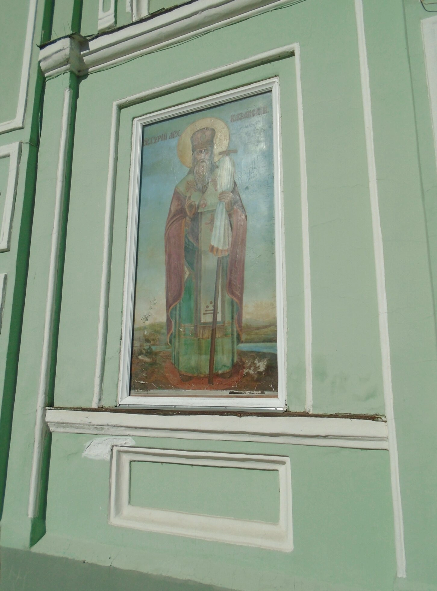 На представленной фотографии запечатлена почитаемая православная святыня — образ святителя Николая, архиепископа Мир Ликийских, чудотворца, расположенный на внешней стене Никольского кафедрального собора города Казани. Икона укреплена на фасаде храма, что является традиционным для русского церковного зодчества способом выражения почитания святого и благословения всех входящих под его небесное покровительство.