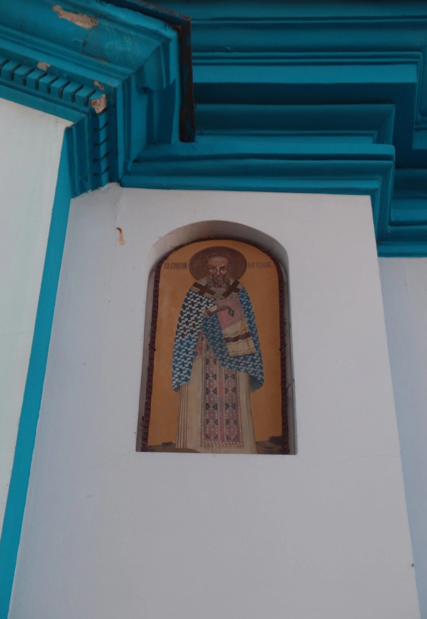Святитель Николай изображён в традиционной иконографии: в архиерейском облачении, с Евангелием в левой руке и с благословляющей десницей. Его лик исполнен духовной мудрости и милосердия, что соответствует его всемирному почитанию как скорого помощника и заступника всех страждущих. Над святым образом расположены декоративные элементы, окрашенные в лазурный цвет, символизирующий небесную чистоту и благодать.