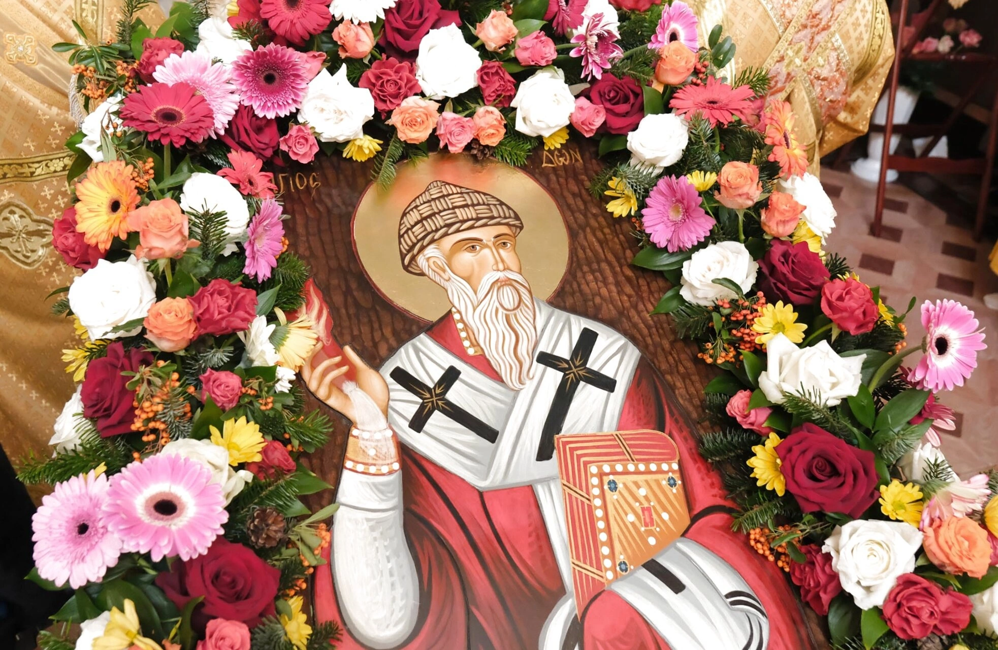 Икона торжественно обрамлена большим и ярким венком из живых цветов. Венок составлен из роз различных оттенков — красных, розовых, белых, а также оранжевых и желтых гербер. Подобное украшение является знаком особого почитания и любви верующих к святителю, а также символизирует нетленную красоту добродетелей, которыми он прославился. Цветы, особенно розы, в христианской символике часто ассоциируются с мученичеством и райским блаженством.