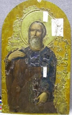 На представленной фотографии запечатлена старинная православная икона, изображающая святого апостола и евангелиста Иоанна Богослова. Святой представлен в традиционном иконографическом образе: со строгими и одухотворёнными чертами лица, длинной седой бородой и благоговейным взором, устремлённым в сторону молящегося. Голову апостола венчает золотой нимб — символ святости и пребывания в Божественном свете.