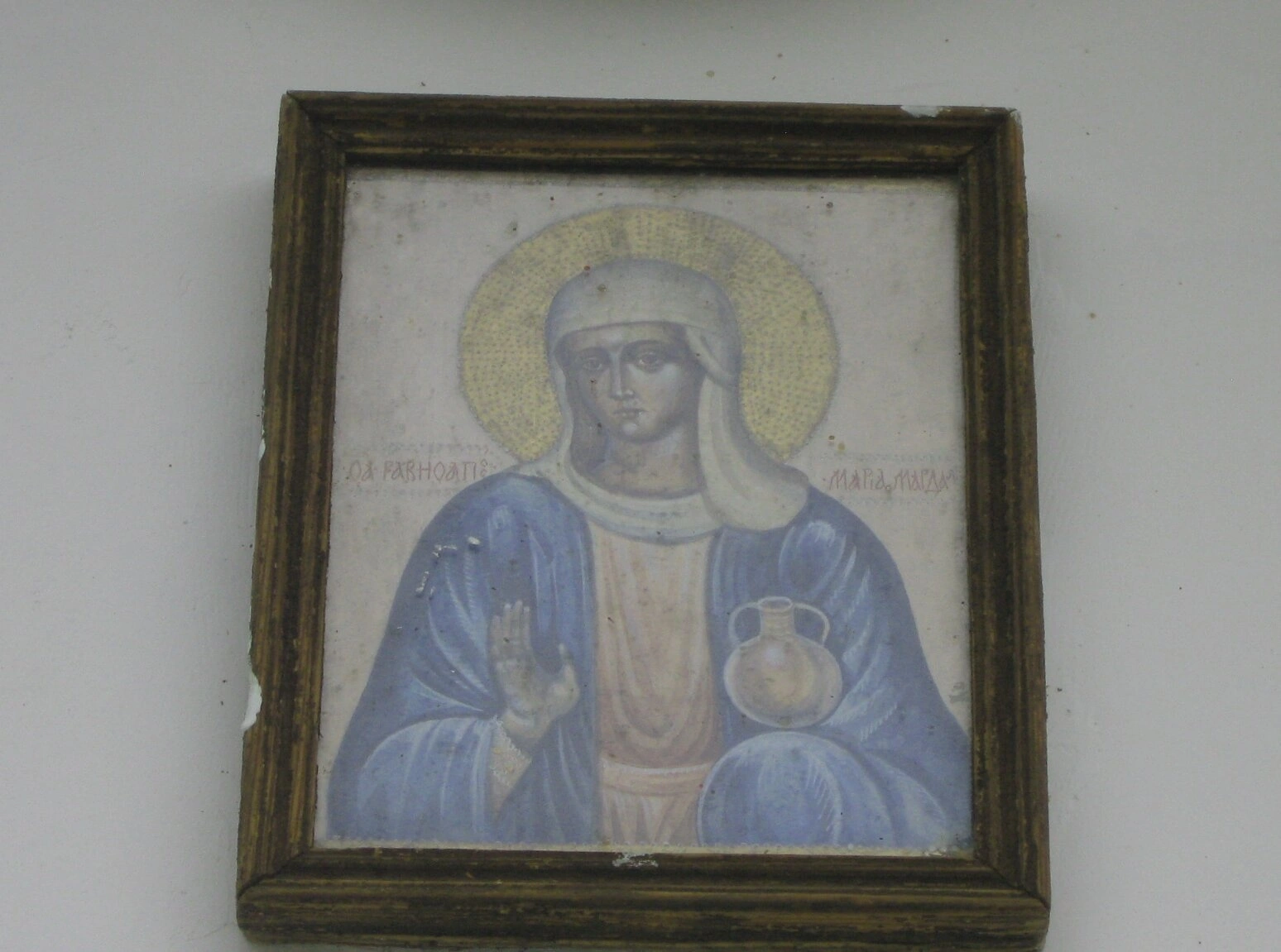 На представленной фотографии запечатлена храмовая икона святой равноапостольной Марии Магдалины, расположенная в церкви в честь этой святой в деревне Улиткино Московской области. Святая образ написана в традиционной православной иконографии и помещена в добротную деревянную раму.