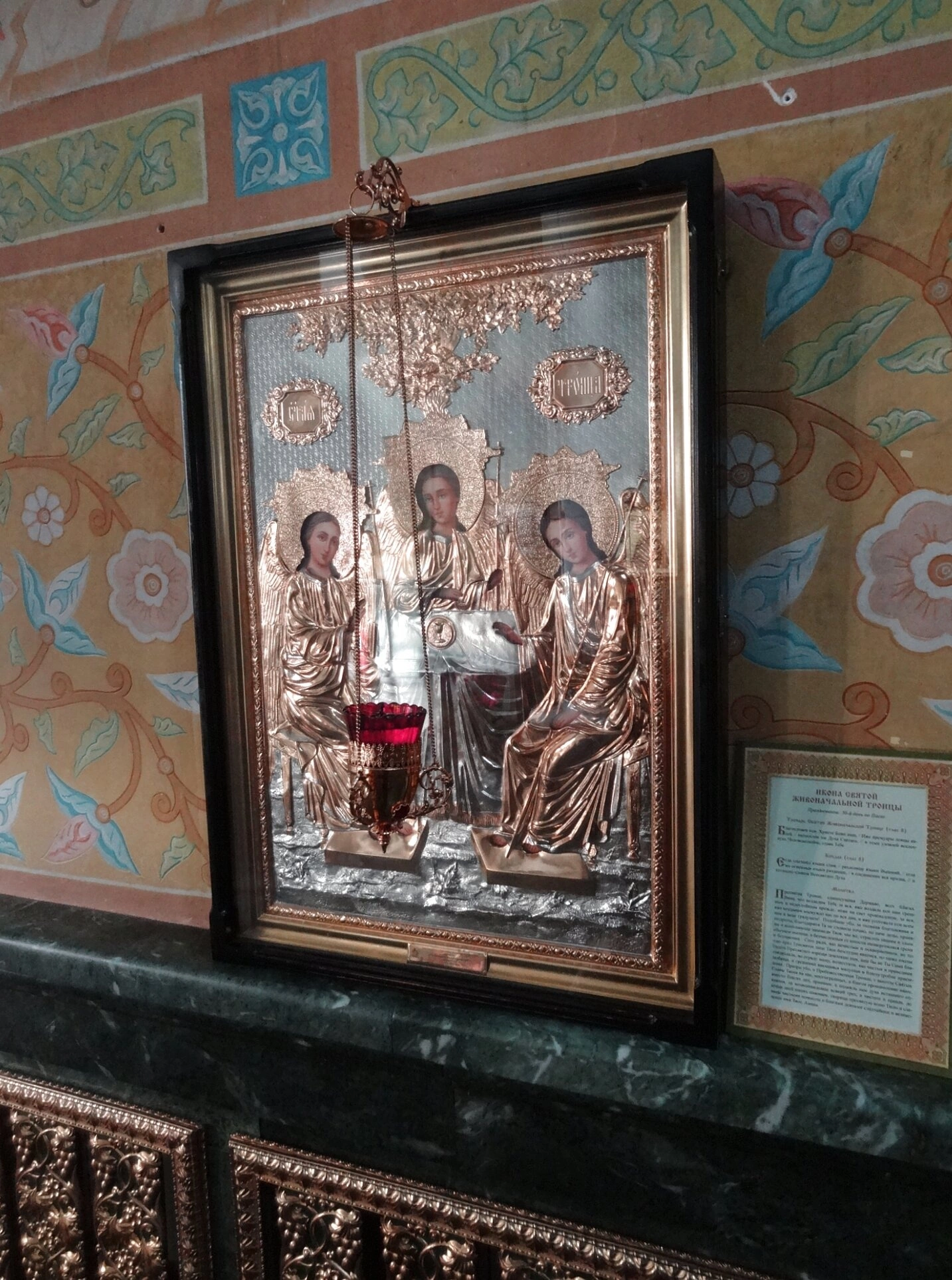 На представленной фотографии запечатлена чтимая икона Святой Троицы, пребывающая в Свято-Троицком кафедральном соборе Екатеринбурга. Священное изображение соответствует канонической иконографии, где три ангела, символизирующие три ипостаси Единого Бога, представлены за трапезой в дубраве Мамврийской.