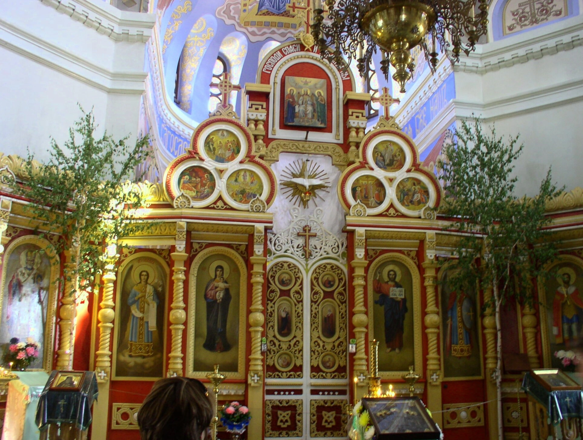 Убранство иконостаса дополняют живые цветы, которые являются символом жизни и радости в доме Божием. Росписи на стенах и сводах храма, видные на фотографии, изображают евангельские сцены и святых угодников. Всё вместе создаёт целостный художественный образ, направляющий мысли молящихся к горнему миру и подчёркивающий сакральную значимость происходящего в алтаре богослужения.