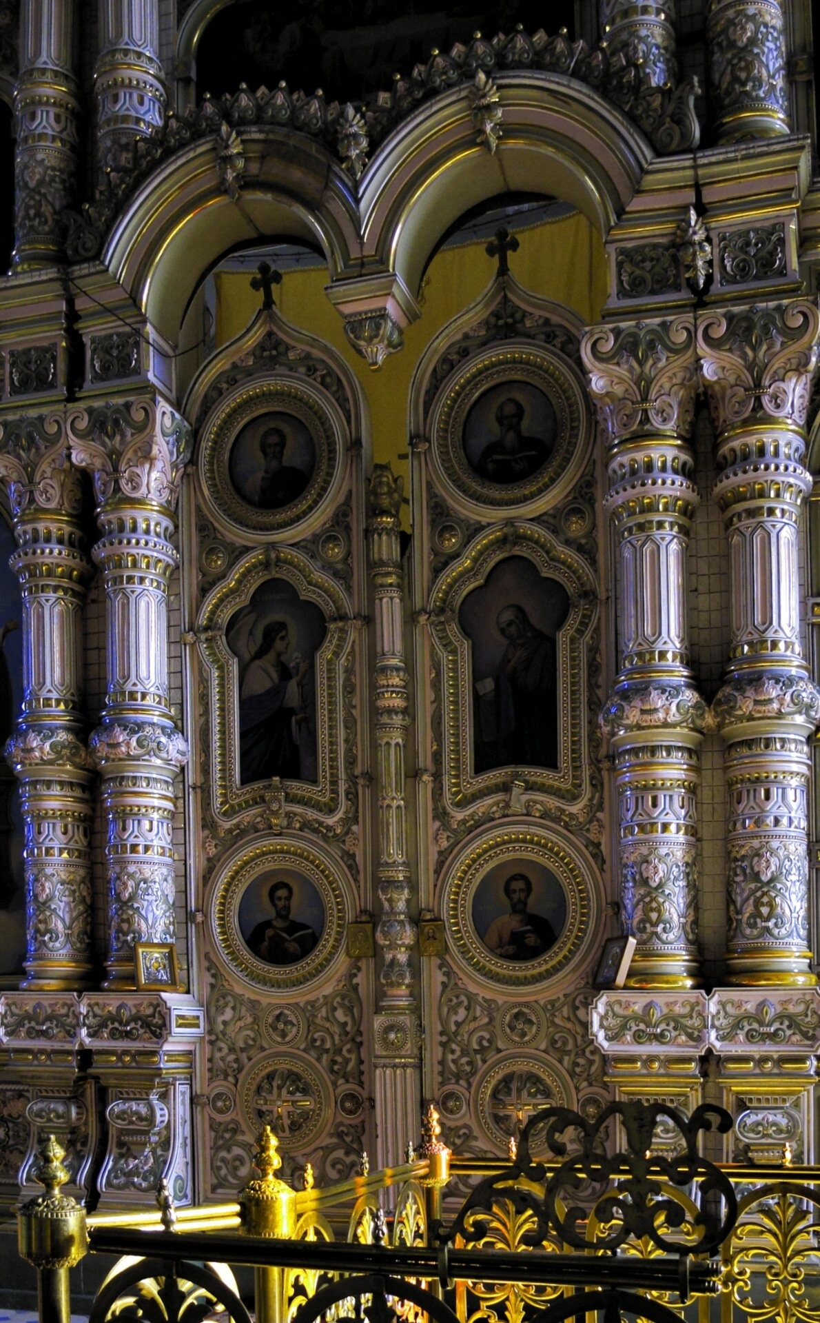 По сторонам от врат расположены иконы в резных золочёных киотах, имеющих как круглую, так и фигурную форму. Эти обрамления, выполненные с высочайшим мастерством, подчёркивают сакральную значимость каждого святого образа. Колонны с пышными капителями делят иконостас на ярусы, придавая всей конструкции монументальность и стройность.