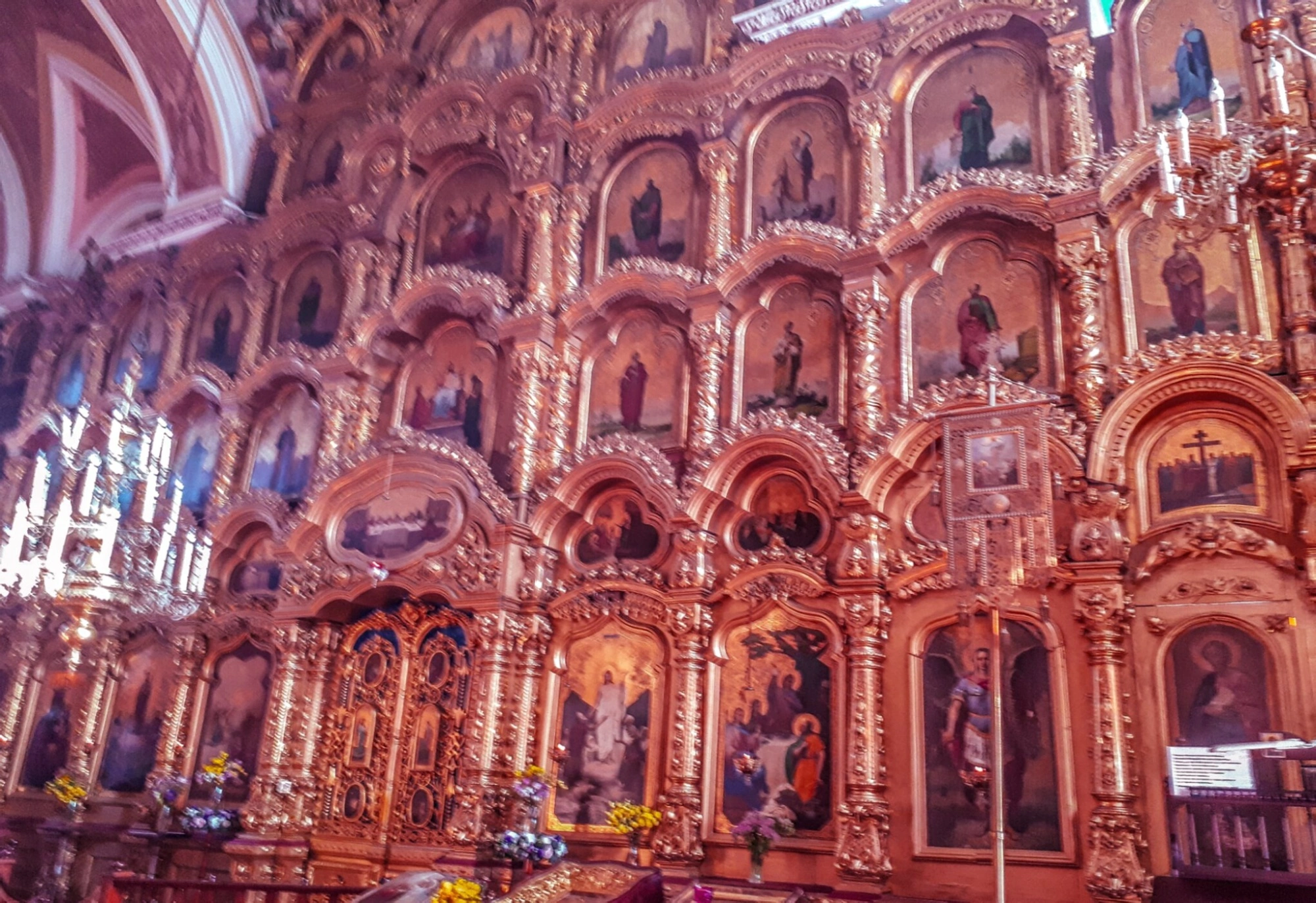 На представленной фотографии запечатлен величественный иконостас Церкви Михаила Архангела, расположенной в древнем городе Торжок Тверской области. Многоярусное сооружение выполнено в традициях русского православного зодчества и поражает богатством художественного оформления.