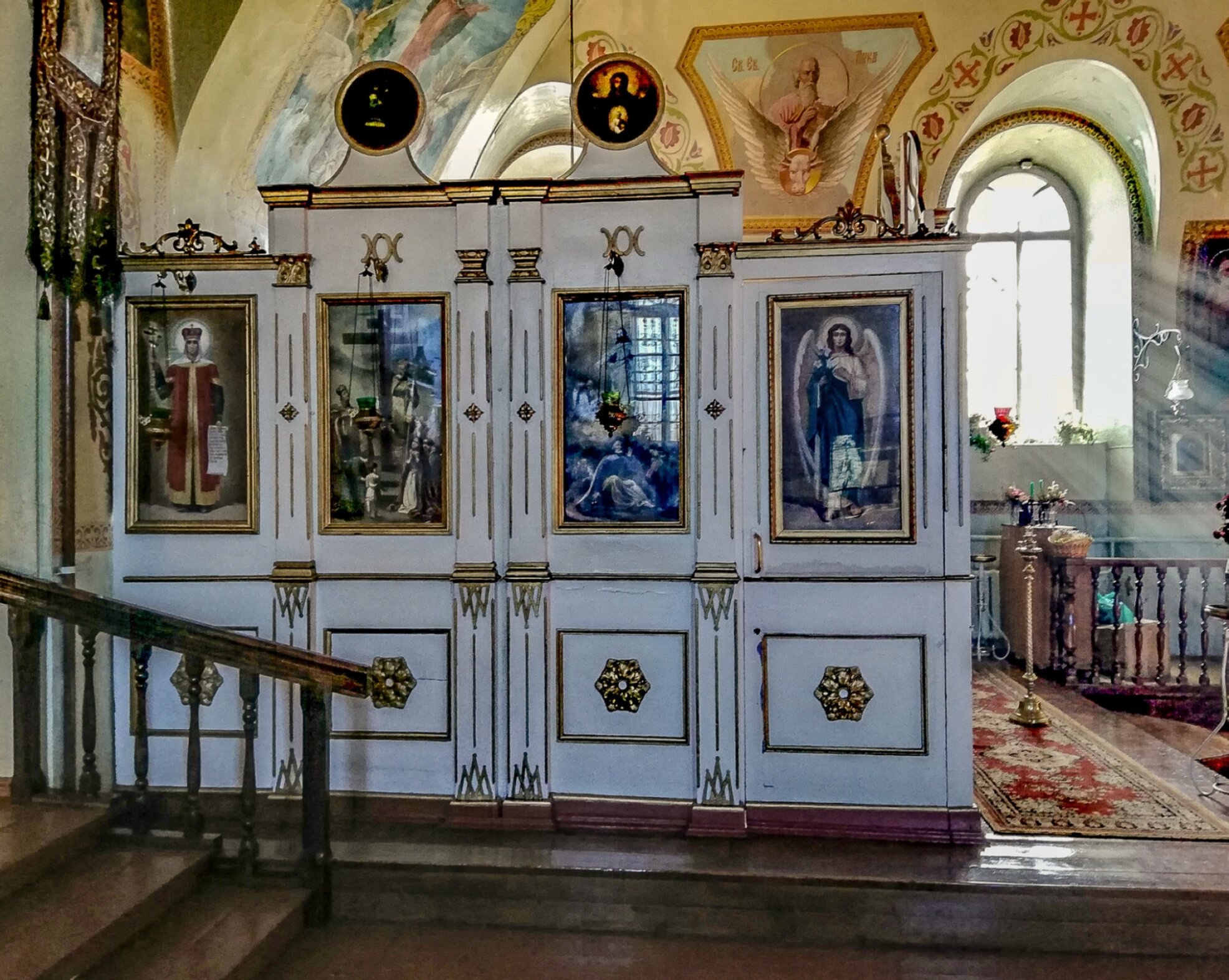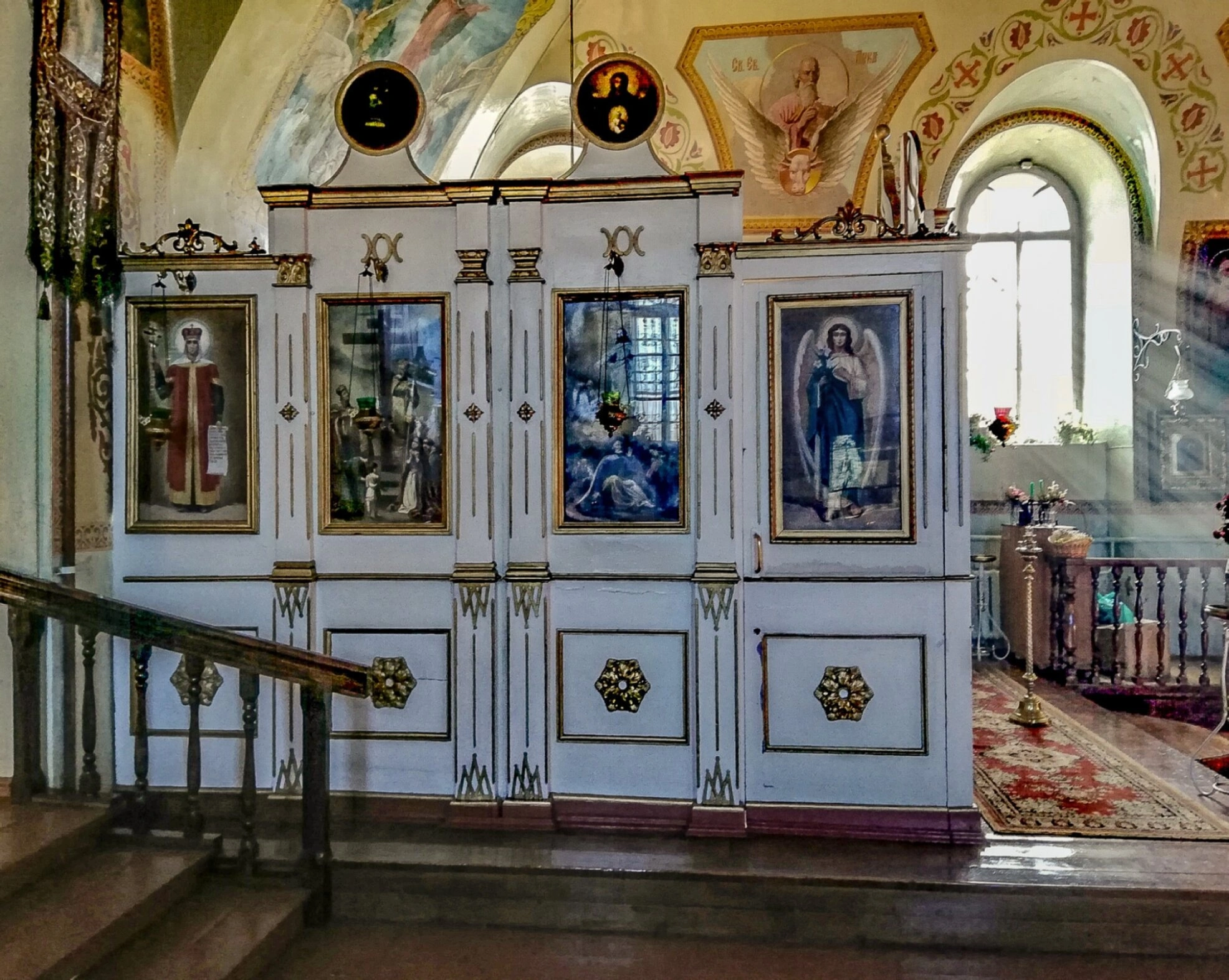 Интерьер храма дополняется настенной росписью, покрывающей своды и стены. Орнаменты и библейские сюжеты в красках создают особую молитвенную атмосферу. Справа от иконостаса видно арочное окно, сквозь которое льётся естественный свет, символически обозначая свет Божественной истины. Пол храма устлан ковровыми дорожками, а наличие балюстрады и амвона подчёркивает традиционное устройство православного церковного пространства.