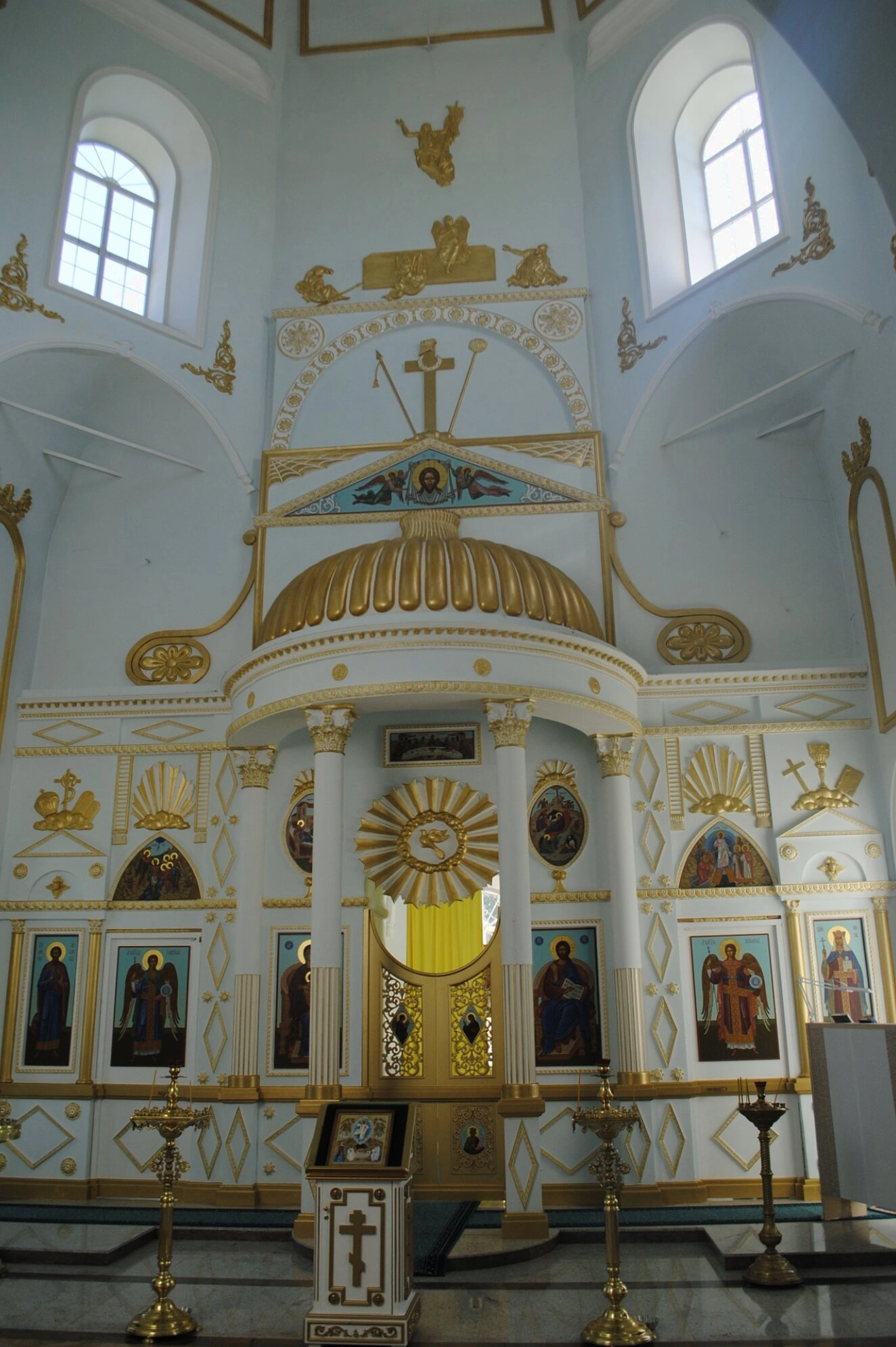 В его чинах размещены священные образы, написанные в канонической православной традиции. Лики Спасителя, Божией Матери и святых угодников взирают на молящихся с глубоким миром и благодатью. Царские Врата, венчаемые сенью, являются центром всей композиции, символизируя врата в Царствие Небесное.