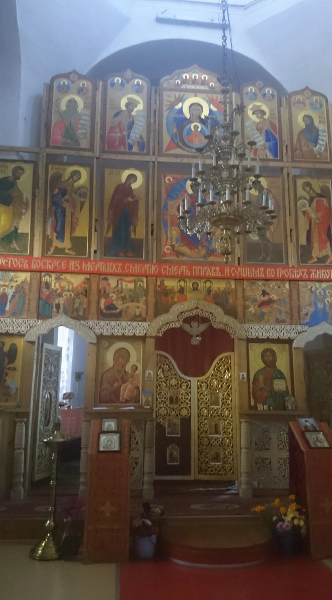 Над вратами располагается праздничный ряд икон, а венчает всю композицию Распятие. В центральной части иконостаса представлены иконы Спасителя и Божией Матери, по сторонам от которых расположены образы особо почитаемых святых. Внимательный взгляд различит на одной из икон текст пасхального тропаря «Христос воскресе из мертвых, смертию смерть поправ, и сущим во гробех живот даровав», что указывает на использование данного образа во время празднования Светлого Христова Воскресения.
