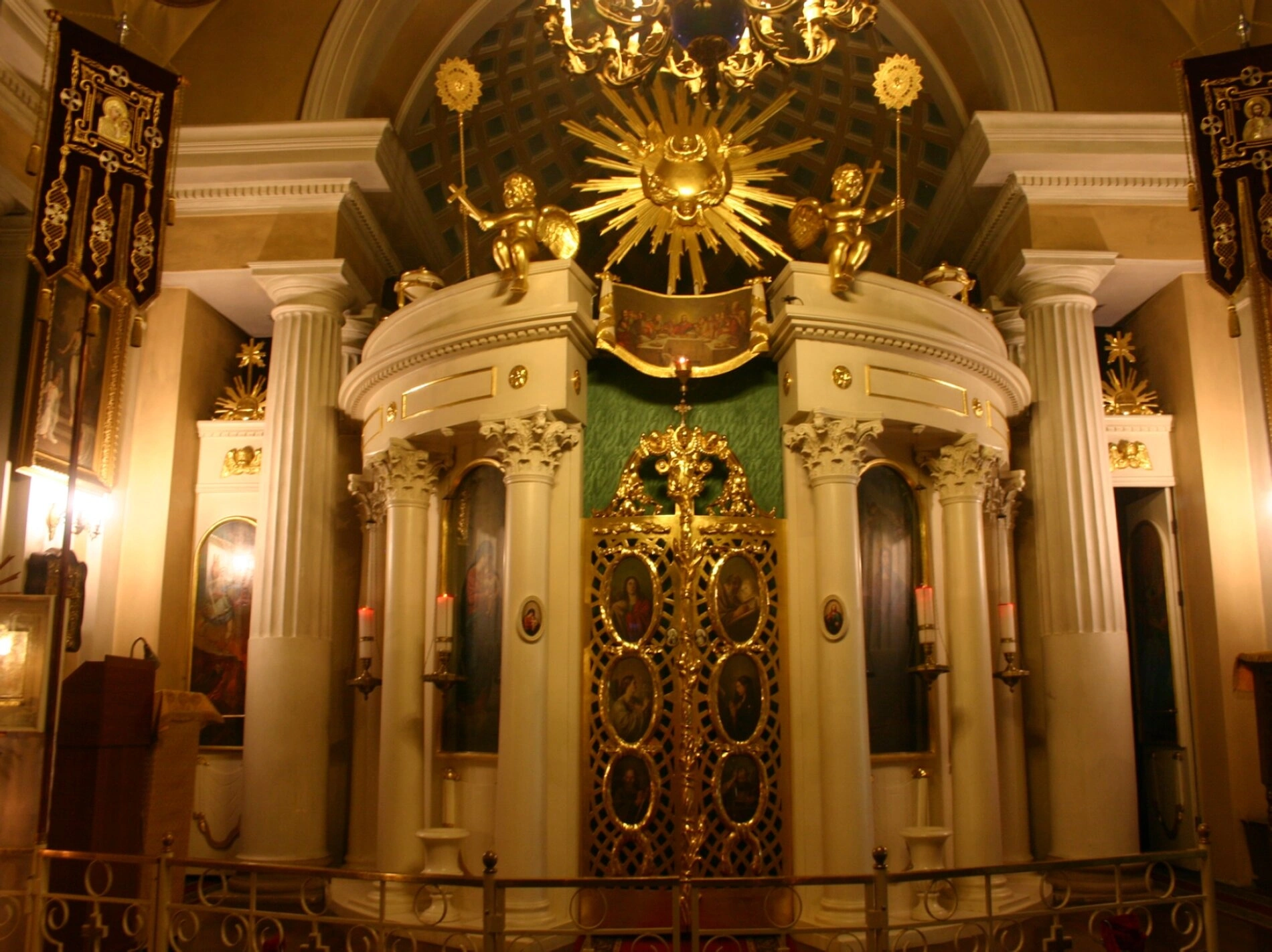 Богатый декор с обилием позолоты, резные элементы и строгая симметрия придают иконостасу торжественный и благолепный вид, характерный для русской церковной архитектуры XVIII-XIX веков. Храм Святой Екатерины, где был сделан этот снимок, является выдающимся памятником классицизма и духовным центром города.