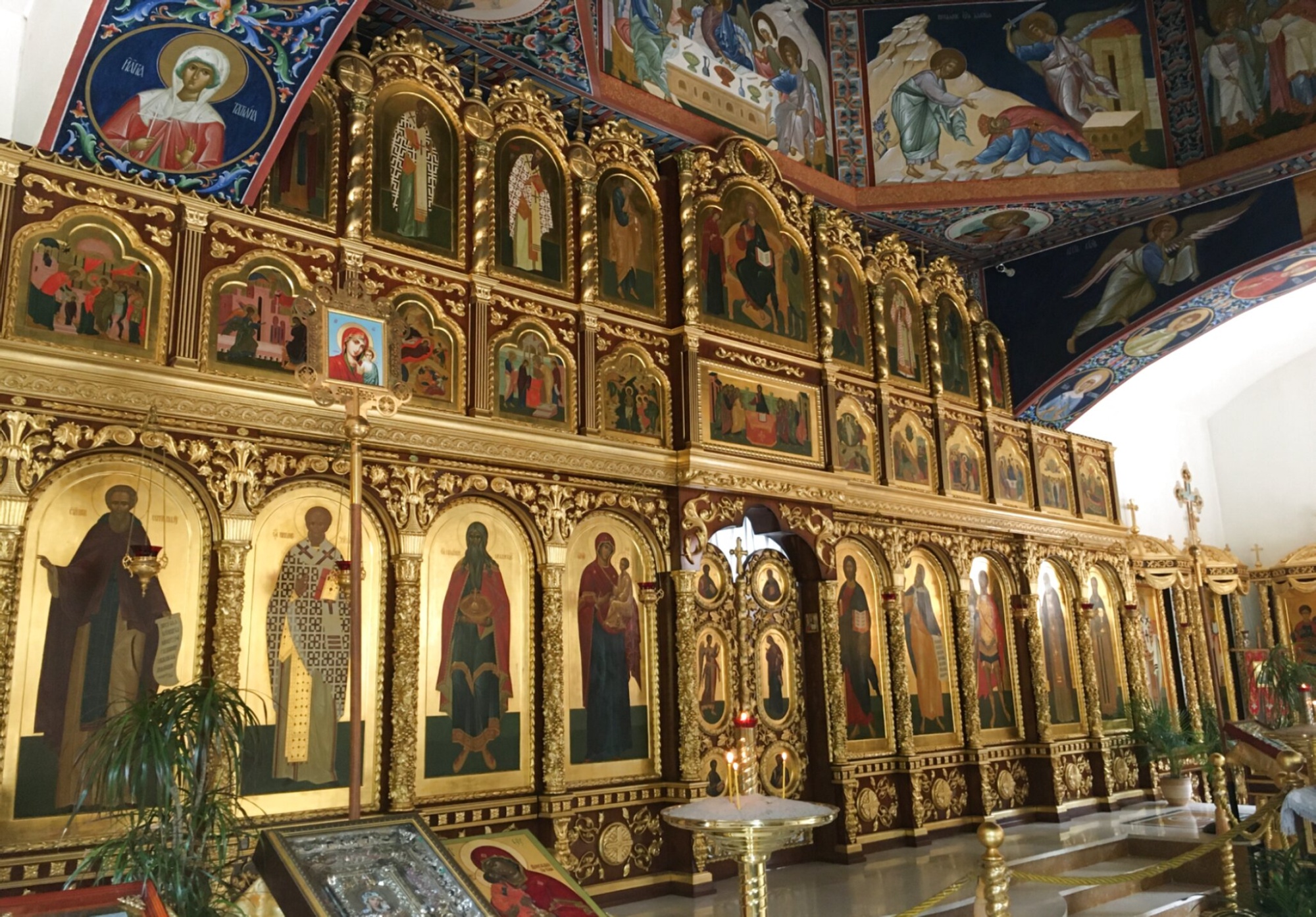 Центральным элементом храмового пространства, приковывающим к себе взор, является многоярусный золочёный иконостас — традиционная алтарная преграда в православных церквях. Его богатое убранство и строгое каноническое построение свидетельствуют о высоком уровне мастерства иконописцев. Иконы, размещённые в несколько рядов, написаны в глубокой духовной традиции и изображают Господа нашего Иисуса Христа, Пресвятую Богородицу, святых угодников Божиих и праздники.