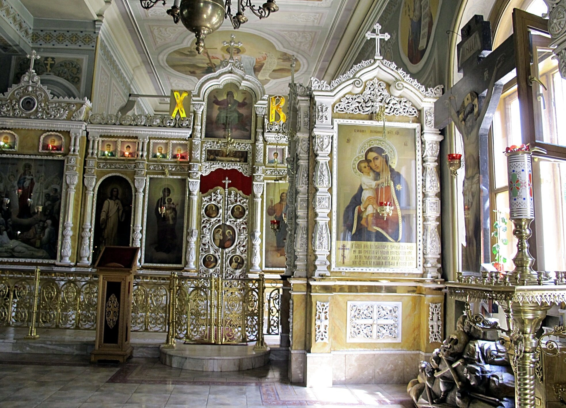 Справа от царских врат находится особо почитаемая икона Пресвятой Богородицы с Младенцем Христом, украшенная драгоценным окладом. По сторонам от нее располагаются другие храмовые образы, включая икону Спасителя и изображения особо чтимых святых. Каждый образ представляет собой уникальное произведение иконописного искусства.