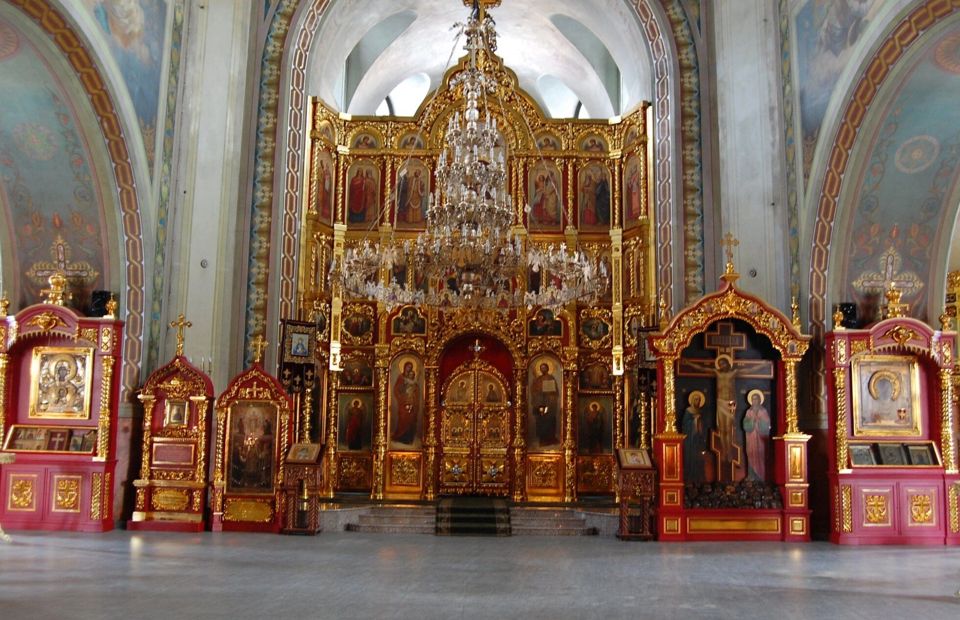 Перед святыми вратами иконостаса располагается нарядная хрустальная люстра, чьи сверкающие подвески символизируют свет Христовой истины, озаряющий верующих. По сторонам от центрального иконостаса находятся два придельных помещения, оформленных в сочетании красных и золотых цветов, что характерно для торжественного убранства православных храмов.