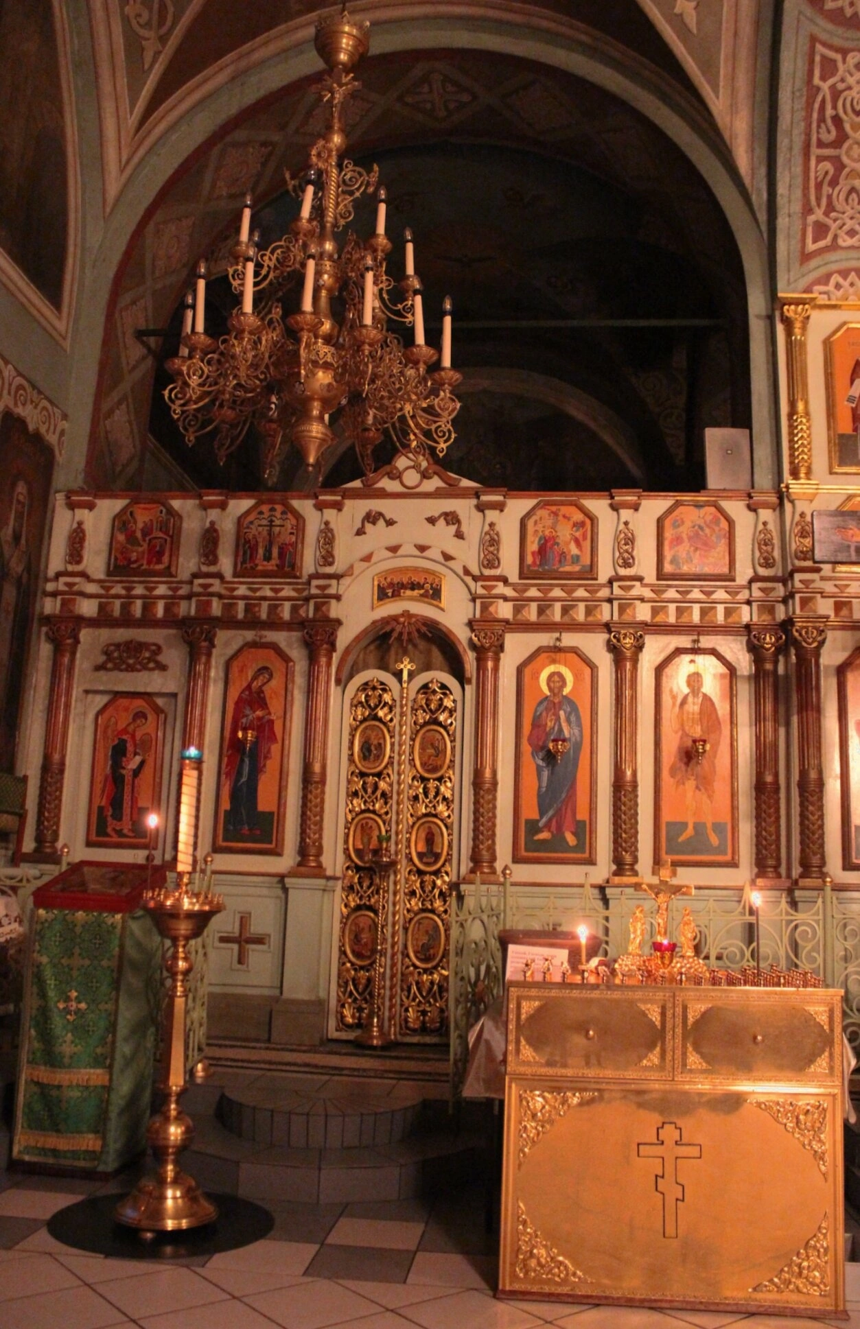 Перед иконостасом установлен аналой — высокий наклонный столик, на котором в данный момент лежит икона для целования верующими. Рядом видны напольные подсвечники, предназначенные для поставления свечей. Верхнюю часть фотографии освещает массивное паникадило — центральная храмовая люстра, множество ламп которой символизируют Небесную Церковь как собрание святых, предстоящих Престолу Божию. Богатое убранство, резьба по дереву и позолота свидетельствуют о высоком художественном уровне убранства храма и благоговейном отношении к святыне.