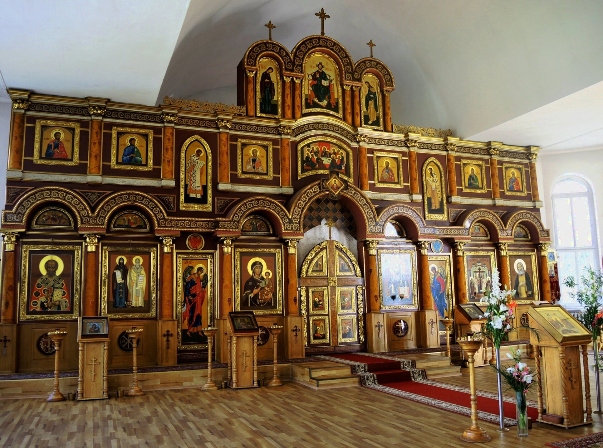 Внутреннее убранство собора гармонично сочетает элементы разных эпох и традиций. Иконостас, изображённый на снимке, выполнен в лучших традициях православного церковного искусства и является духовным центром храмового пространства, притягивающим взоры молящихся во время богослужений.