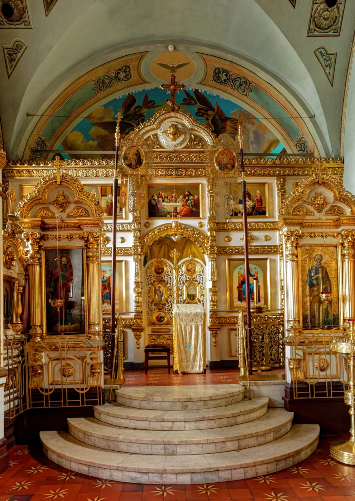 Храм Святых Апостолов Петра и Павла, где находится данный иконостас, был построен в 1865 году на средства самарского купечества и является объектом культурного наследия. Церковь пережила годы лихолетья, будучи возвращённой верующим в 1990-е годы, и ныне является действующим приходом Самарской епархии Русской Православной Церкви. Фотография передаёт благолепие и намоленную атмосферу этого святого места, призывая верующих к молитве и созерцанию.