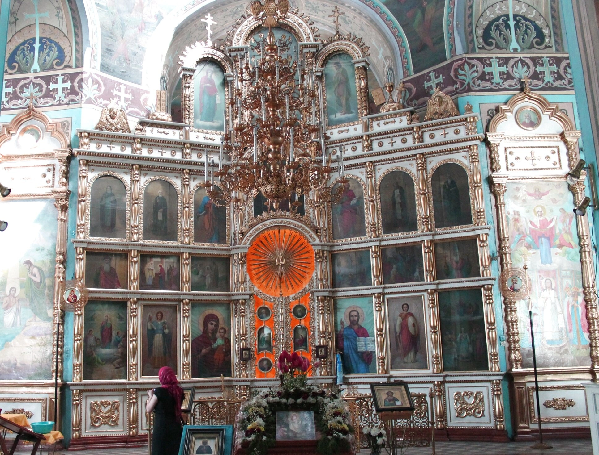 На представленной фотографии запечатлён величественный иконостас Покровского храма, находящегося в городе Рыльске Курской области. Многоярусный позолоченный иконостас, выполненный в традициях русского церковного искусства, является духовным и архитектурным центром интерьера храма.