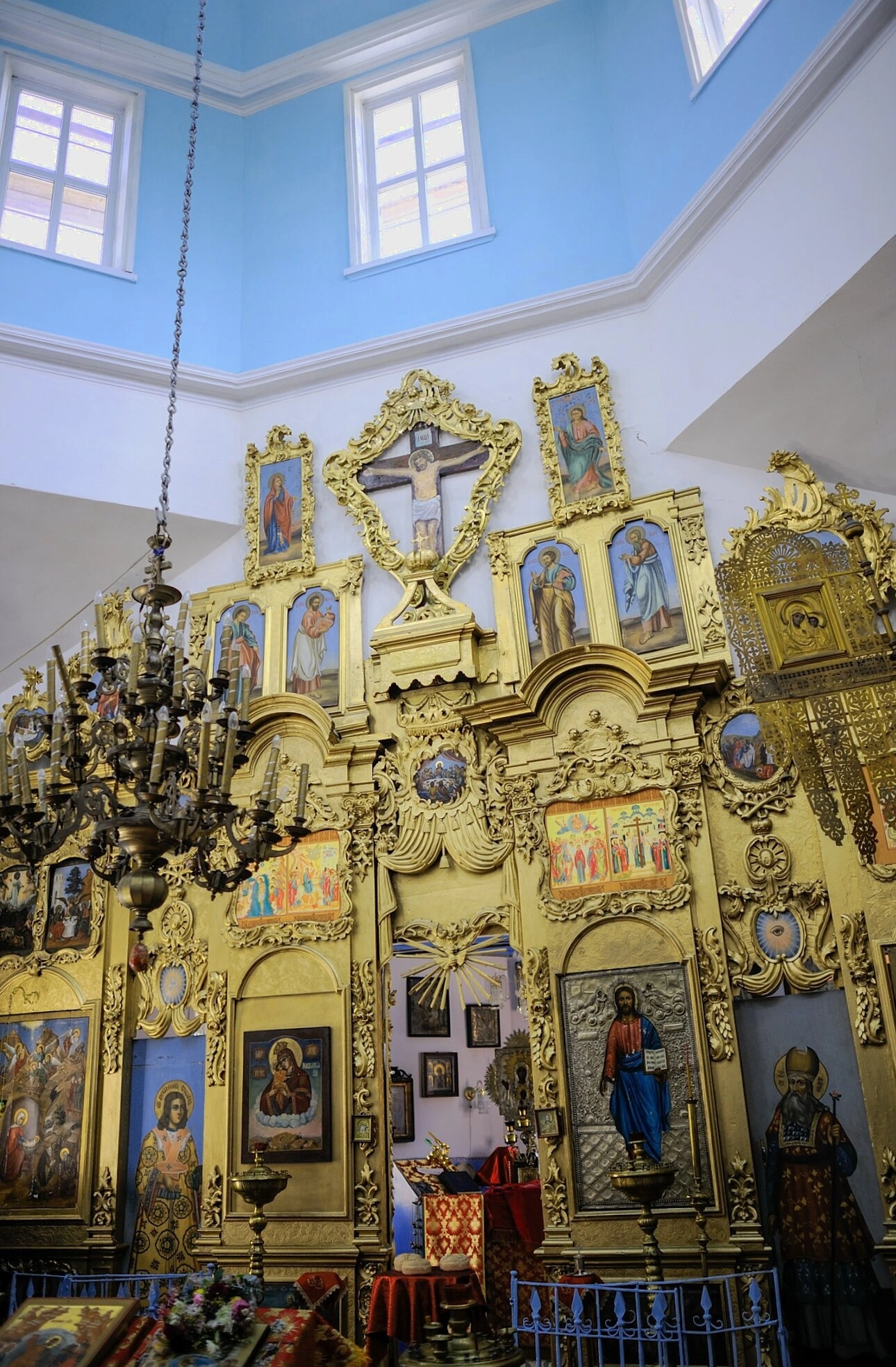 Иконостас выполнен из натурального дерева и богато украшен позолоченной резьбой, что свидетельствует о высоком мастерстве тверских резчиков. Многоярусная конструкция характерна для традиционных русских иконостасов и включает в себя местный, праздничный, деисусный и пророческий чины. Каждый элемент резного декора тщательно проработан и несет глубокую символическую нагрузку.