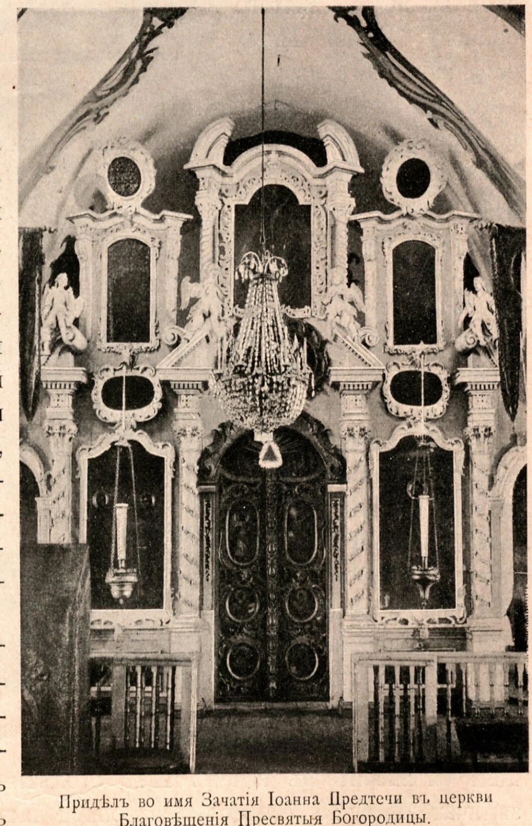 На представленной фотографии запечатлен интерьер придела во имя Зачатия святого Иоанна Предтечи, располагавшегося в Благовещенской церкви на Васильевском острове в Санкт-Петербурге. Снимок был сделан в период 1900-х годов и представляет значительную историко-культурную ценность.