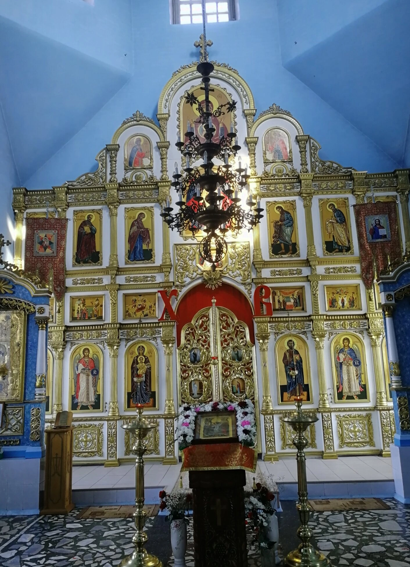 Резной деревянный иконостас, выполненный в традициях русского церковного искусства, поражает своей детализацией и богатством убранства. Позолота и обилие декоративных элементов подчёркивают сакральную значимость этого места, являющегося центром литургической жизни прихода. Через царские врата, расположенные в центре, во время богослужения выходит священнослужитель, несущий верующим благодать Святого Духа.