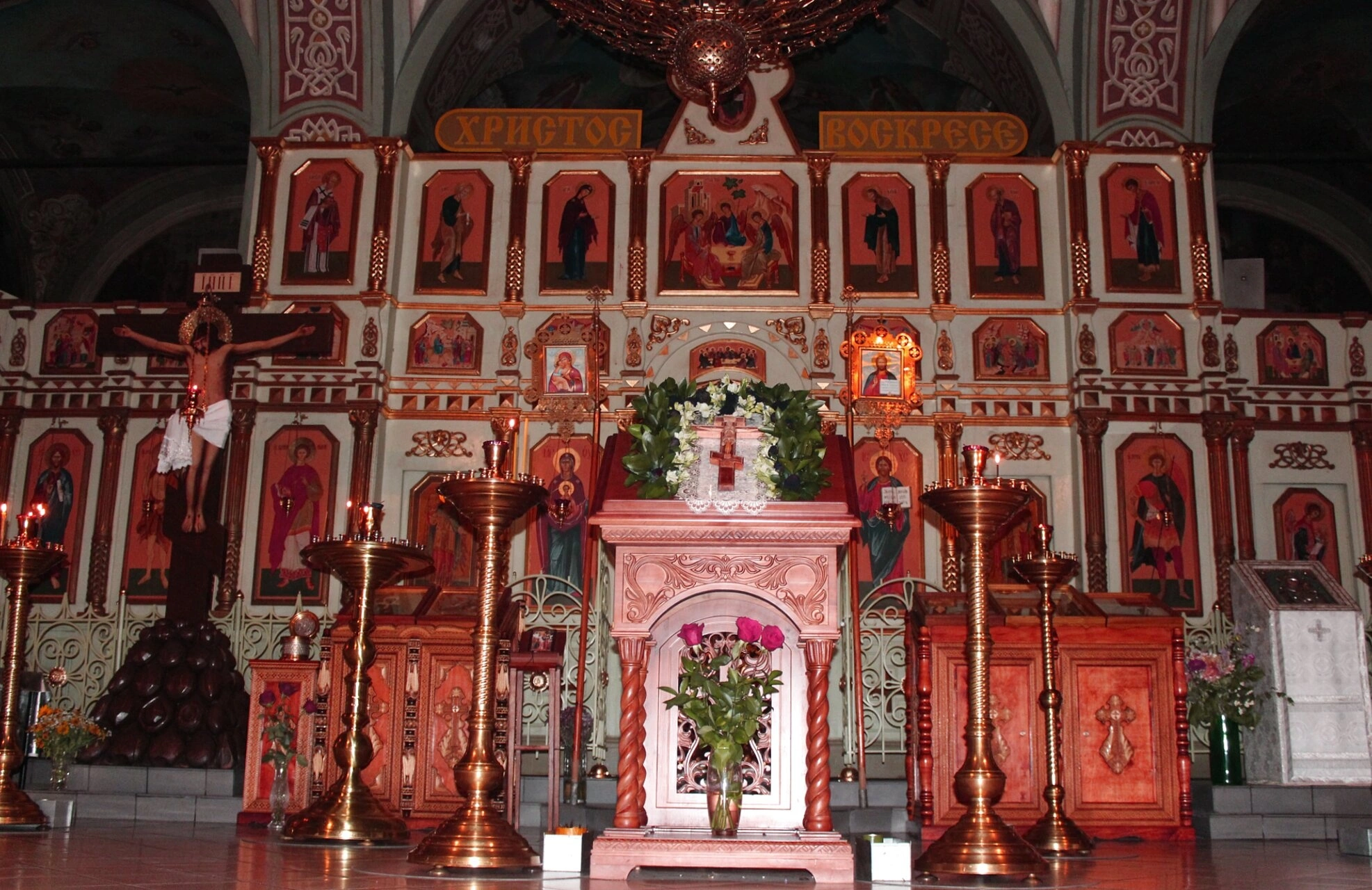Центральным элементом композиции являются Царские врата, через которые во время Божественной литургии выносятся Святые Дары. Над вратами красуется главная надпись, выражающая суть христианской веры — «ХРИСТОС ВОСКРЕСЕ». Эта пасхальная радость является смысловым центром всего храмового пространства.
