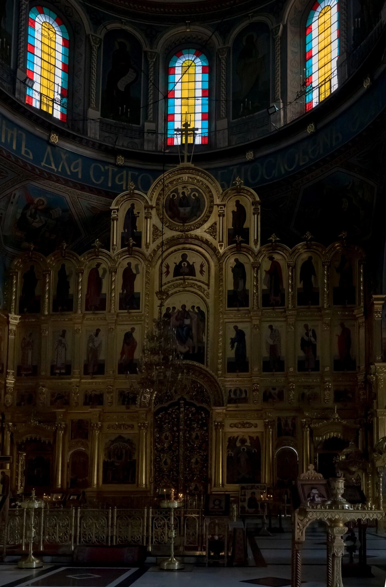 На фотографии запечатлён величественный многоярусный иконостас Свято-Троицкого кафедрального собора, являющегося архитектурной доминантой и одной из главных духовных святынь города Калуги. Золочёная резьба, покрывающая конструкцию, поражает своей сложностью и искусностью исполнения, отражая свет от многочисленных лампад и свечей, что создаёт ощущение неземного сияния и благодати.