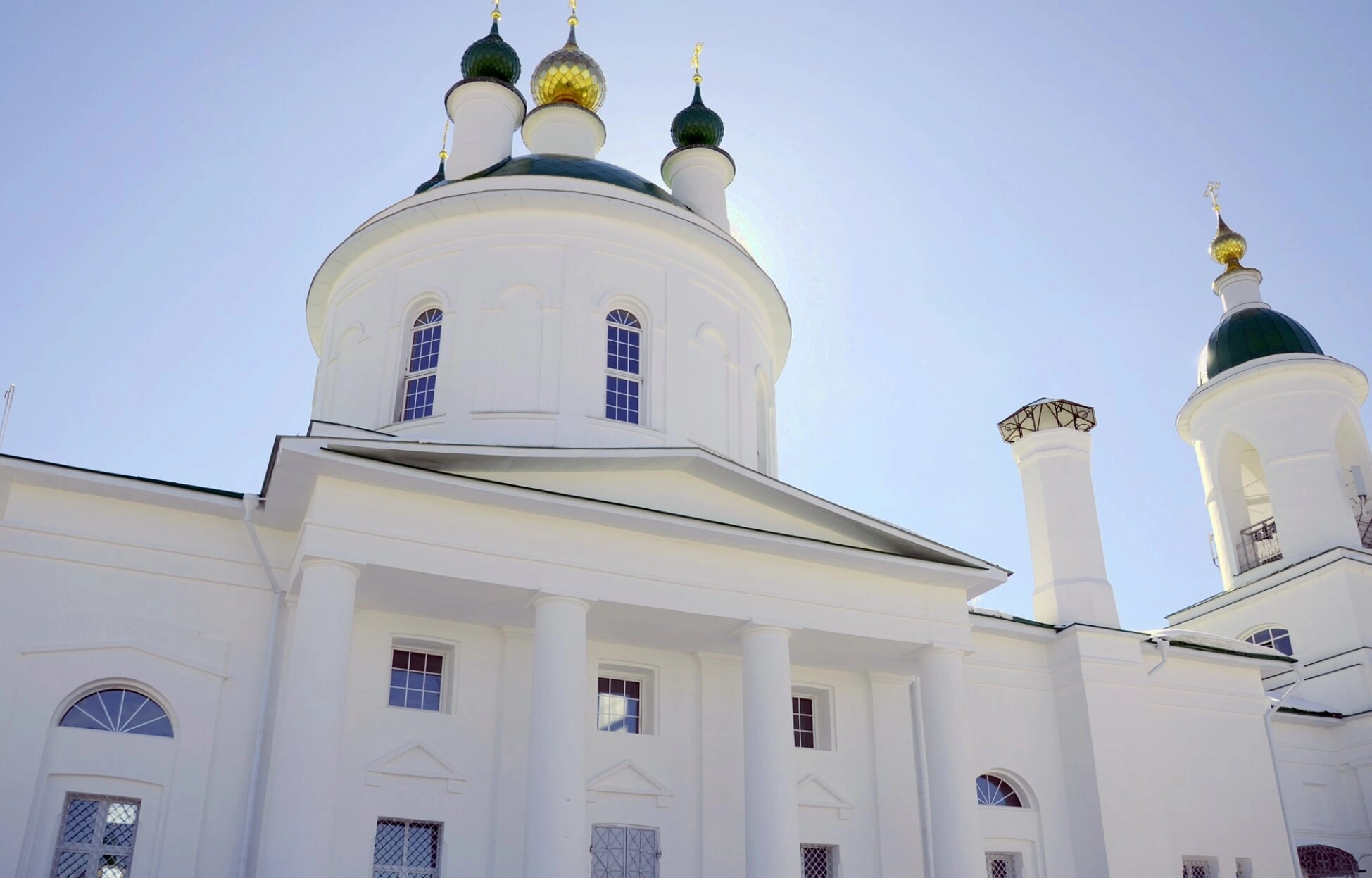На представленной фотографии запечатлён величественный облик Ильинской церкви, являющейся одной из архитектурных и духовных доминант города Иваново. Белоснежный храм, увенчанный зелёными куполами и сияющими на солнце золотыми главками, эффектно выделяется на фоне ясного голубого неба, символизируя небесную чистоту и благодать.