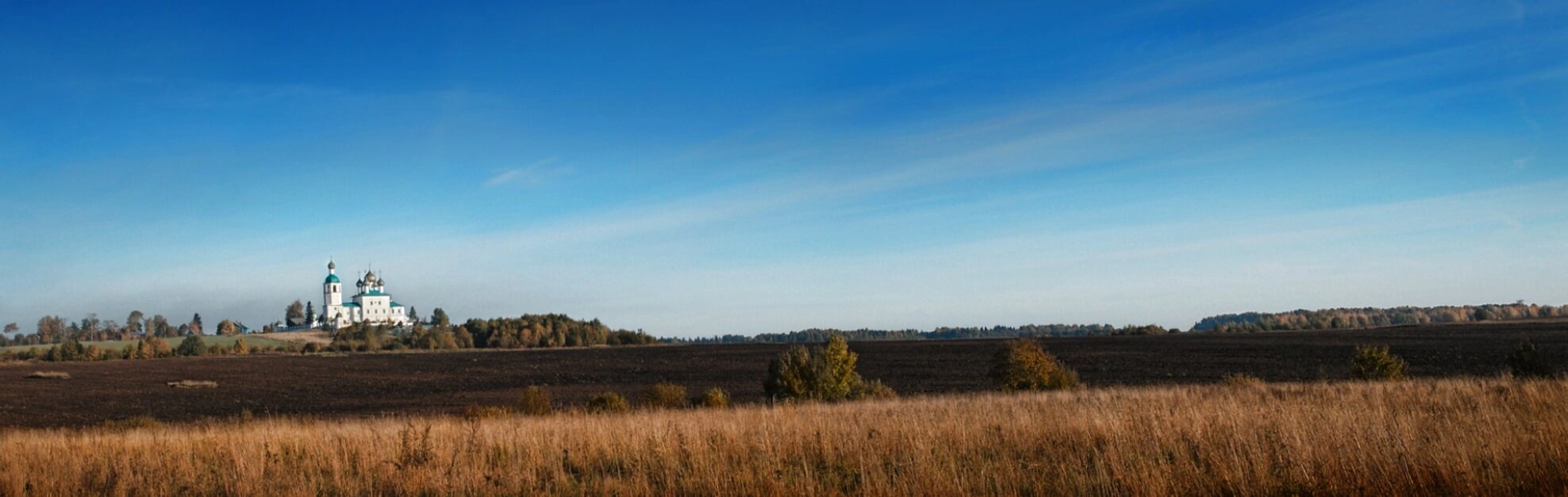 Белоснежный храм, увенчанный традиционными луковичными главами, возвышается на небольшом холме, доминируя над окружающим равнинным ландшафтом. Его стройный силуэт чётко вырисовывается на фоне высокого голубого неба, символизируя устремлённость человеческой души к горнему миру. Пожухлая трава на переднем плане и тёмные участки земли свидетельствуют о знойном лете, однако зелень деревьев, окружающих церковь, и лесная полоса на горизонте придают пейзажу жизненную силу.