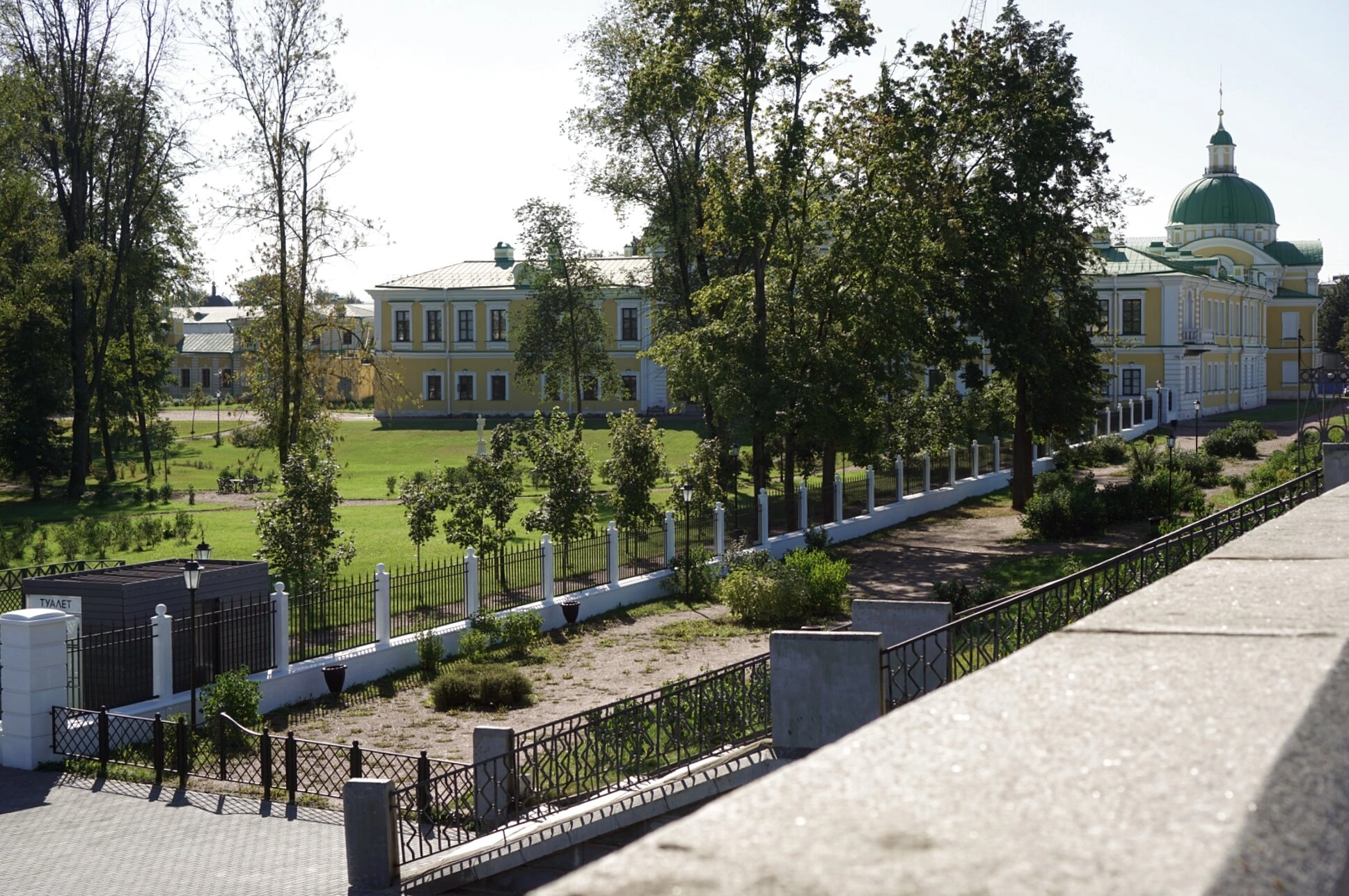 Территория вокруг дворца благоустроена в соответствии с его статусом: ухоженный парк с аккуратно подстриженными газонами и декоративными деревьями обрамляет архитектурный комплекс. На переднем плане фотографии видно каменное ограждение с художественными металлическими решетками, а также фрагмент мощёной дорожки, ведущей ко входу в здание.