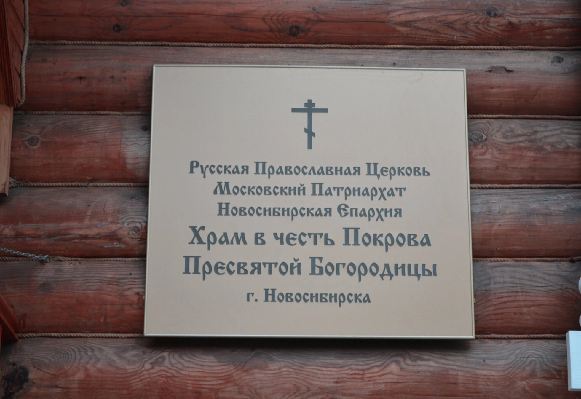 Текст на табличке гласит: «Русская Православная Церковь Московский Патриархат Новосибирская Епархия Храм в честь Покрова Пресвятой Богородицы г. Новосибирска». Эта надись однозначно идентифицирует объект как Покровский храм, находящийся в каноническом подчинении Новосибирской епархии Русской Православной Церкви.