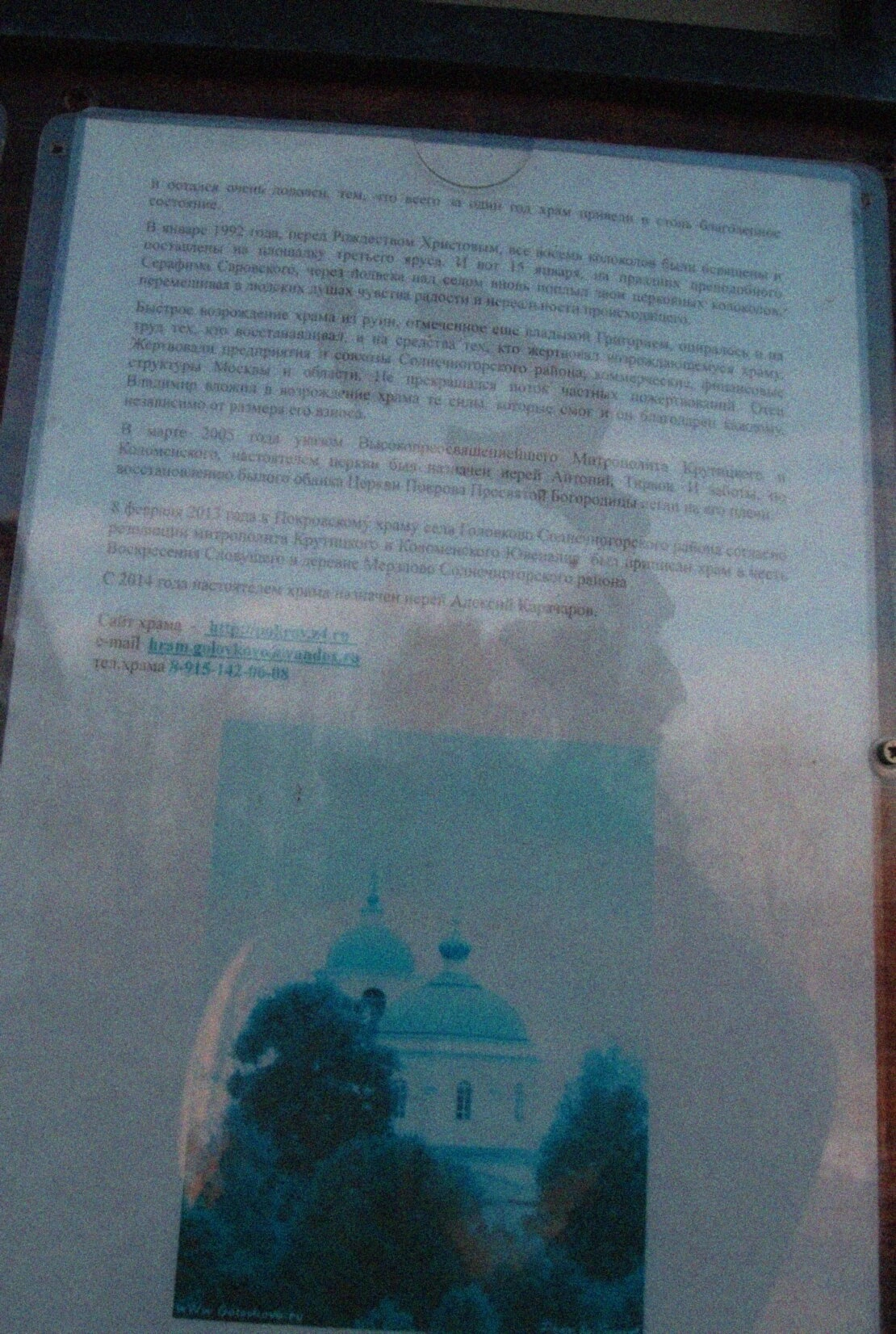 На представленной фотографии запечатлена информационная табличка, установленная рядом с храмом Покрова Пресвятой Богородицы в селе Головково Солнечногорского района Московской области. На табличке содержится краткий исторический очерк, повествующий о непростом пути этой православной святыни.