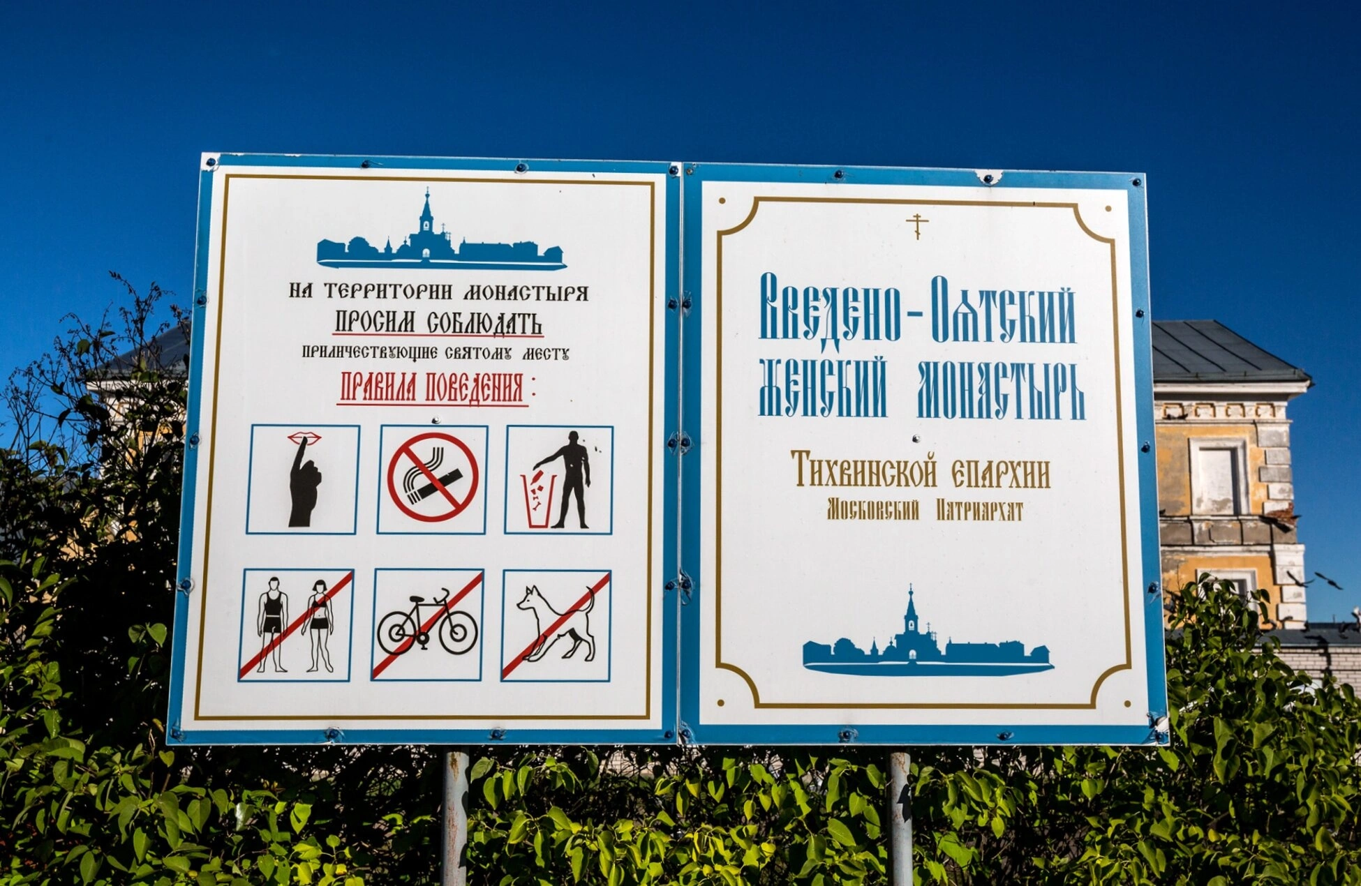Левая часть стенда посвящена правилам поведения, которые приличествуют святому месту. Они представлены в виде наглядных пиктограмм, запрещающих следующие действия: громкие разговоры и создание шума, дабы не нарушать молитвенное сосредоточение насельниц и паломников; курение, поскольку тело христианина есть храм Духа Святого; выбрасывание мусора, ибо следует хранить в чистоте не только душу, но и окружающее пространство; посещение в неподобающей одежде (например, в купальном костюме), что свидетельствует о неуважении к святыне; езду на велосипеде, дабы не искушать других суетой и не нарушать тишину; выгул собак, дабы не причинять беспокойства молящимся. Эти правила основаны на многовековой традиции монастырского благочиния и способствуют созданию условий для молитвы и духовного сосредоточения.