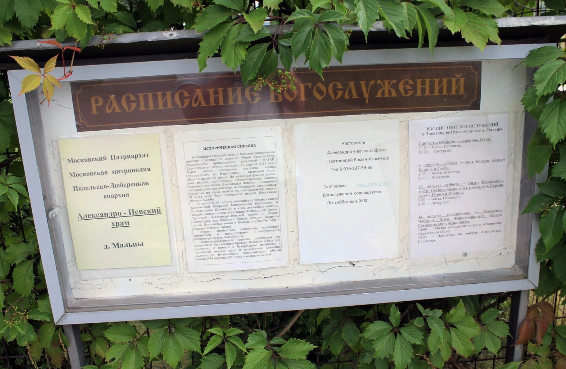 На фотографии запечатлен информационный стенд, установленный на территории храма святого благоверного князя Александра Невского в деревне Мальцы Чеховского городского округа Московской области. Стенд, частично обрамленный зеленью, несет важную информацию для прихожан и паломников.