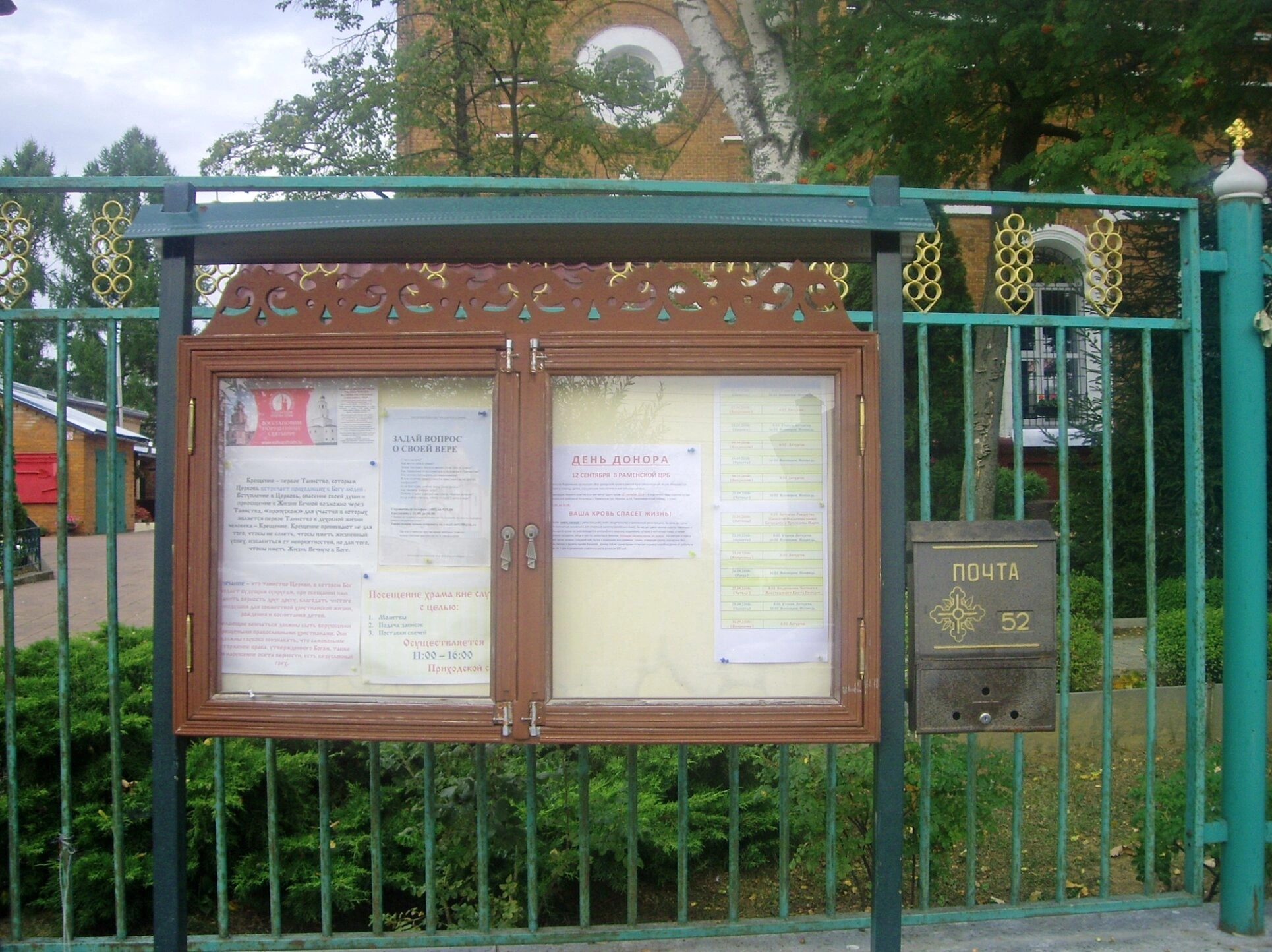 Рядом со стендом установлен традиционный металлический почтовый ящик синего цвета с номером «52» и четкой надписью «ПОЧТА». Его наличие подчеркивает, что храм, несмотря на свой древний статус, является полноценным участником современной жизни, имеющим постоянную связь с внешним миром.