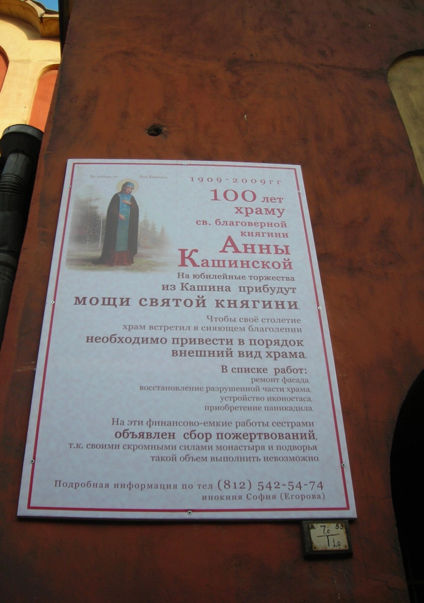 На фотографии запечатлён информационный стенд, размещённый на фасаде храма во имя Святой Благоверной Княгини Анны Кашинской, что расположен в Санкт-Петербурге. Данный плакат был установлен в ознаменование особого исторического события — столетнего юбилея со дня освящения этого святого места. Торжества проходили в 2009 году, отмечая временной период с 1909 по 2009 год.
