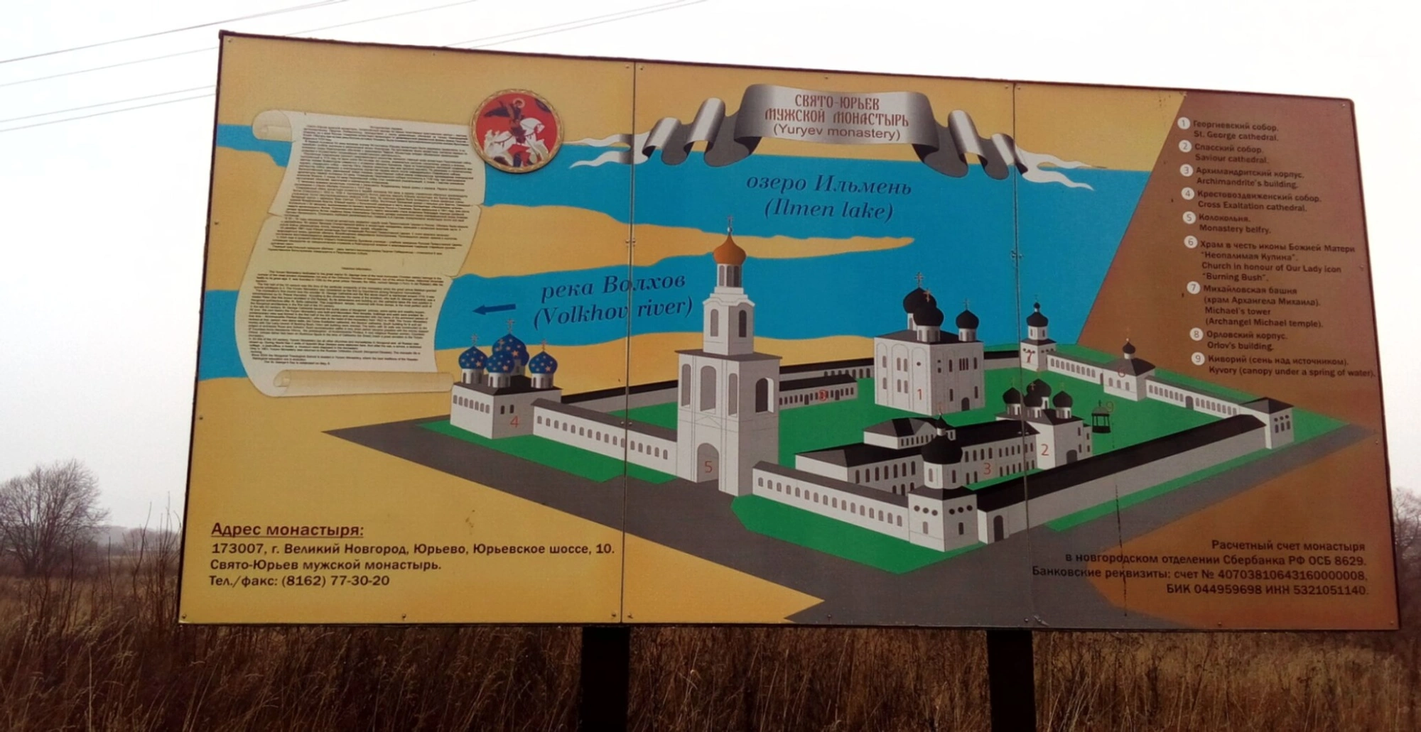 На представленной фотографии запечатлен информационный стенд, установленный на территории одной из древнейших русских обителей — Свято-Юрьева мужского монастыря в Великом Новгороде. Данный стенд предназначен для ознакомления паломников и туристов с богатейшей историей и архитектурным наследием монастыря.