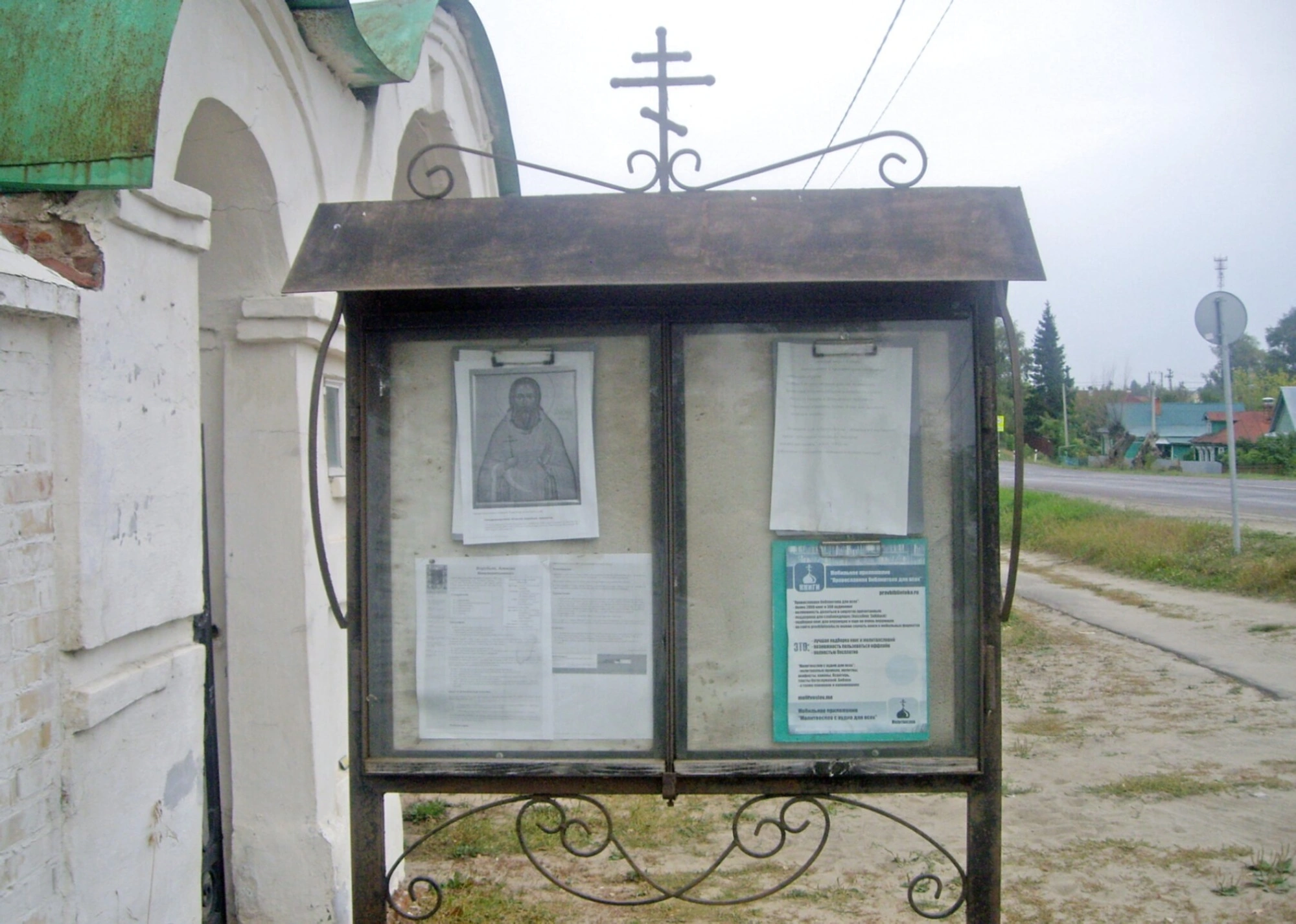 Под сенью креста на стенде размещены различные материалы духовно-просветительского характера. Среди них можно различить объявления о предстоящих праздничных богослужениях, молебнах и панихидах, а также, вероятно, образ святого или почитаемого подвижника благочестия, что является традиционной практикой для ознакомления верующих с житием угодников Божиих. Подобные стенды выполняют крайне важную функцию в духовной жизни прихода, оповещая христиан о жизни церковной общины.