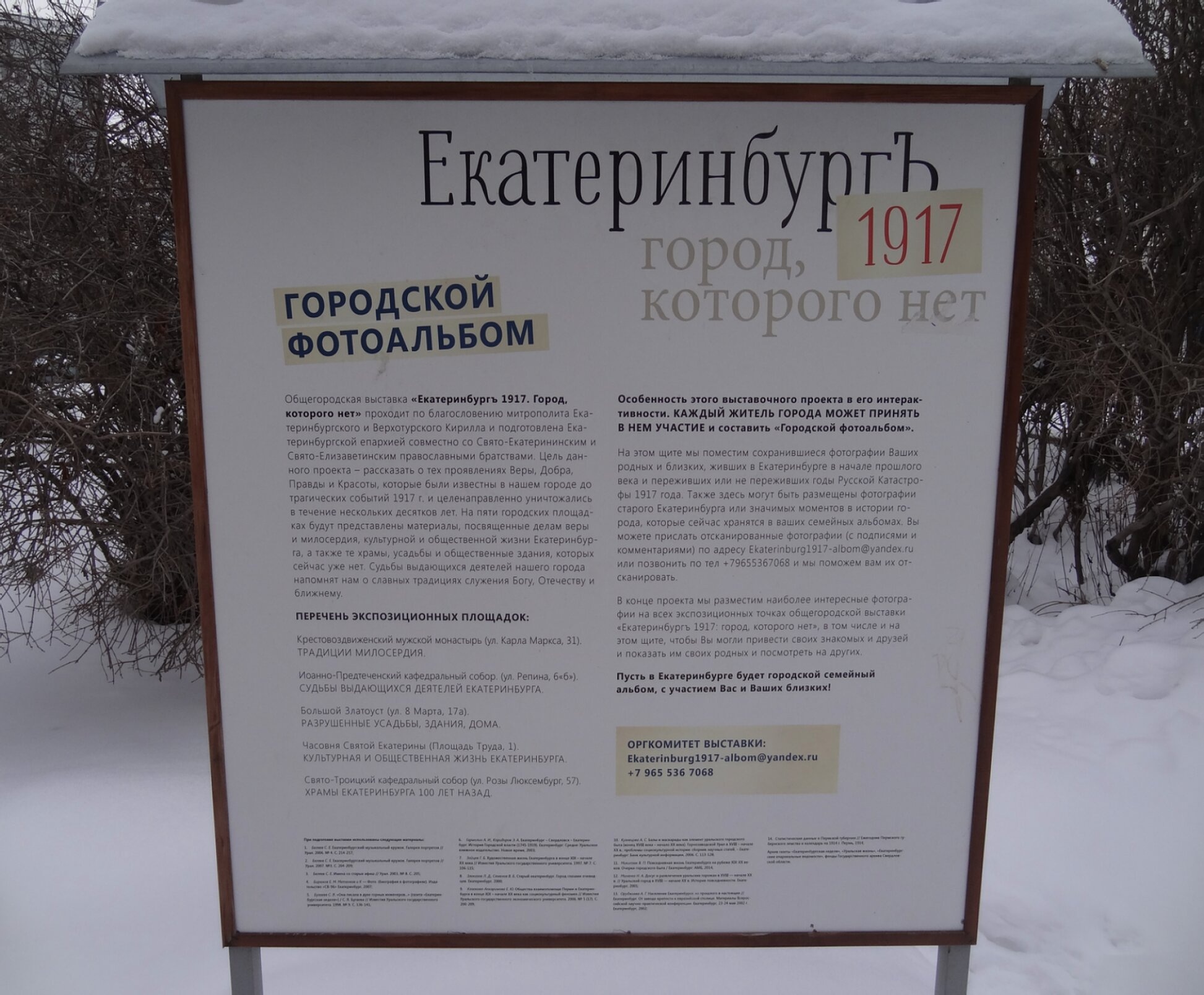 - Информационный стенд выставки «Екатеринбургъ 1917. Город, которого нет» у часовни Святой Екатерины