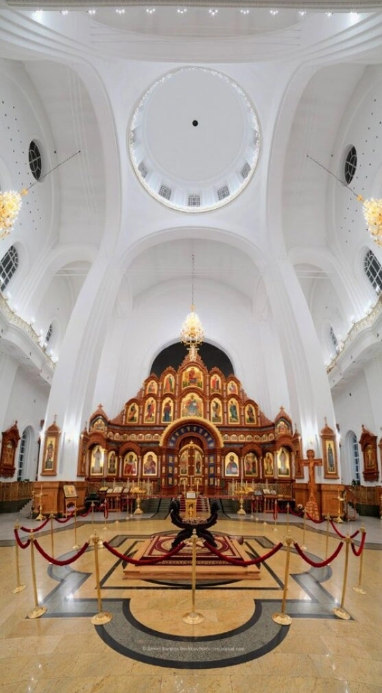 Центральное место на снимке занимает великолепный многоярусный иконостас, выполненный с искусной резьбой по дереву и украшенный позолотой. Иконы, размещённые в нём, написаны в канонической традиции православной иконописи и излучают благодатный свет. Взгляд устремляется ввысь, к подкупольному пространству, где в барабане, прорезанном высокими окнами, изображены лики святых, а в самом куполе традиционно помещается образ Христа Вседержителя.