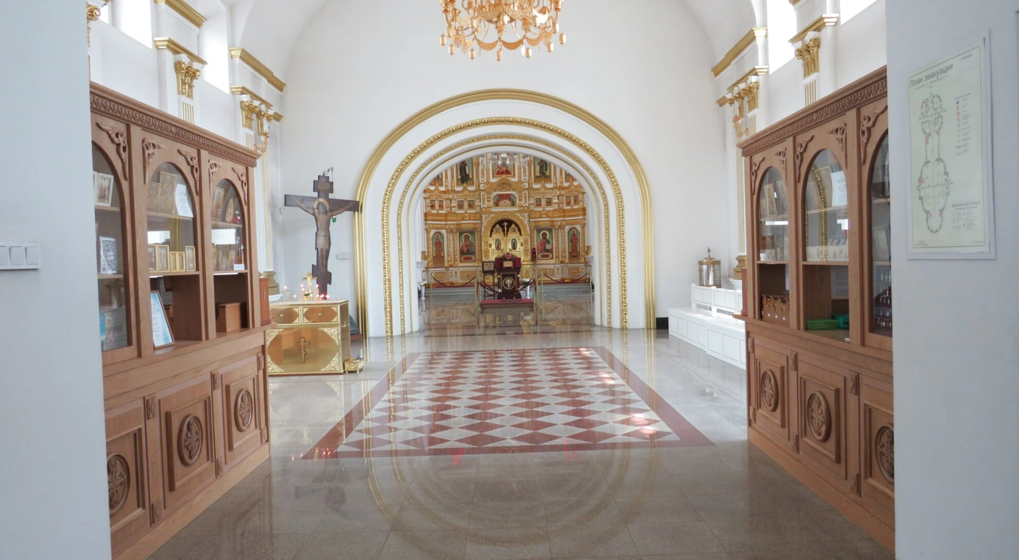 Сводчатые потолки, украшенные росписями на библейские сюжеты, поддерживаются мощными колоннами, что создаёт ощущение небесного величия и Божественной благодати. Массивная позолоченная люстра, символизирующая небесную сферу, освещает молитвенное пространство, наполняя его тёплым светом.