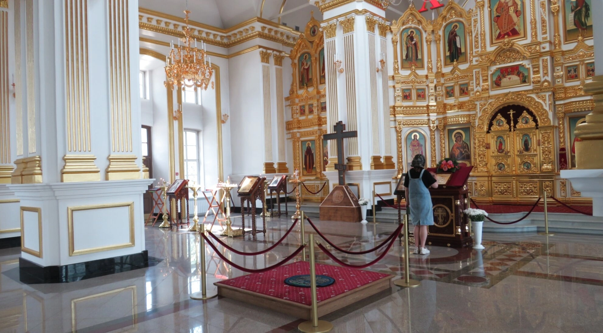 В центре собора, перед алтарной преградой, установлен высокий деревянный аналой с распятием или праздничной иконой, предназначенный для поклонения верующих. Пространство храма освещается природным светом, льющимся из окон, и многорожковой паникадилом, свисающей с небесного свода. Особого внимания заслуживает уникальный пол собора, выложенный из полированного камня. Его глянцевая поверхность отражает свет и величественные архитектурные формы, создавая эффект неземного пространства, устремлённого ввысь. На снимке улавливается присутствие прихожанки, что позволяет оценить грандиозный масштаб сооружения и передаёт атмосферу намоленного места. Богоявленский собор является выдающимся памятником церковной архитектуры и духовным центром Костромы.