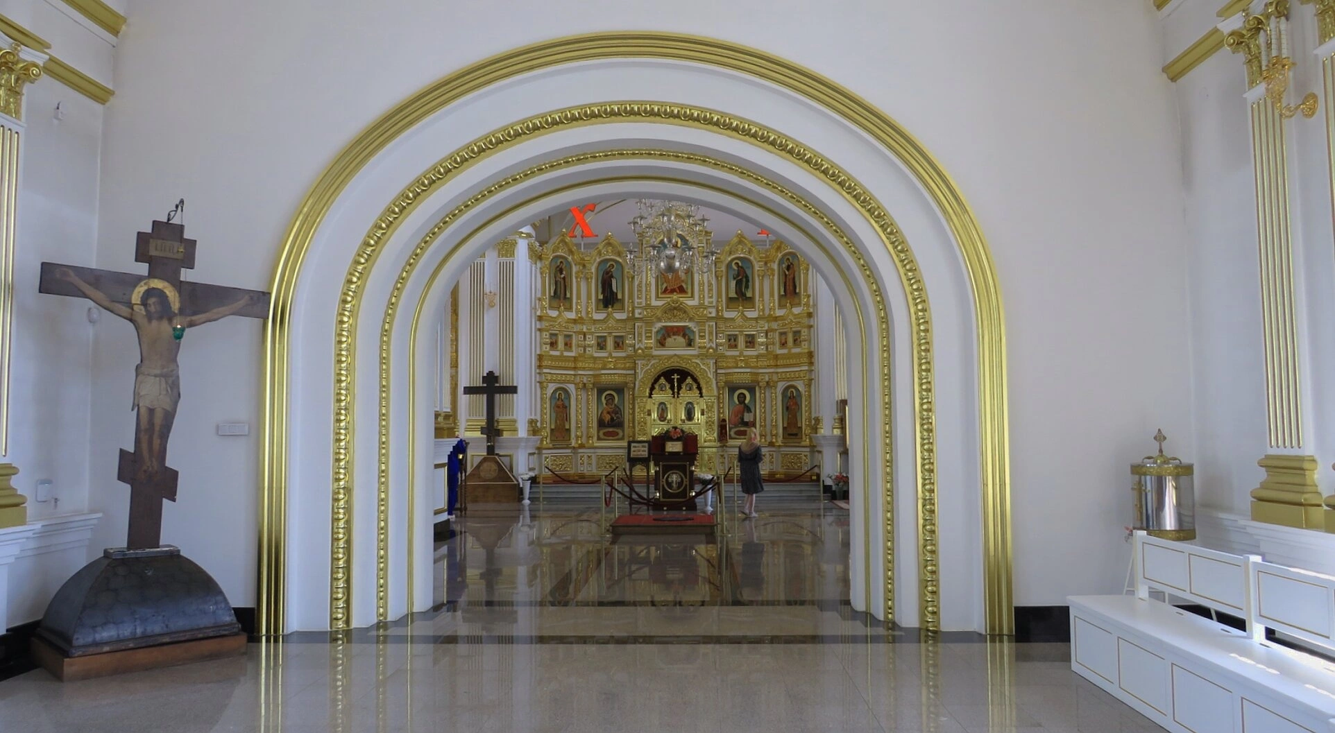 На представленной фотографии запечатлён величественный интерьер кафедрального Богоявленского собора, являющегося частью ансамбля Костромского кремля. Центральным элементом композиции выступает монументальный многоярусный иконостас, выполненный в традициях русского церковного искусства. Его золочёная резьба, выполненная с высочайшим мастерством, мерцает в свете церковных лампад и свечей, создавая атмосферу неземного благолепия.