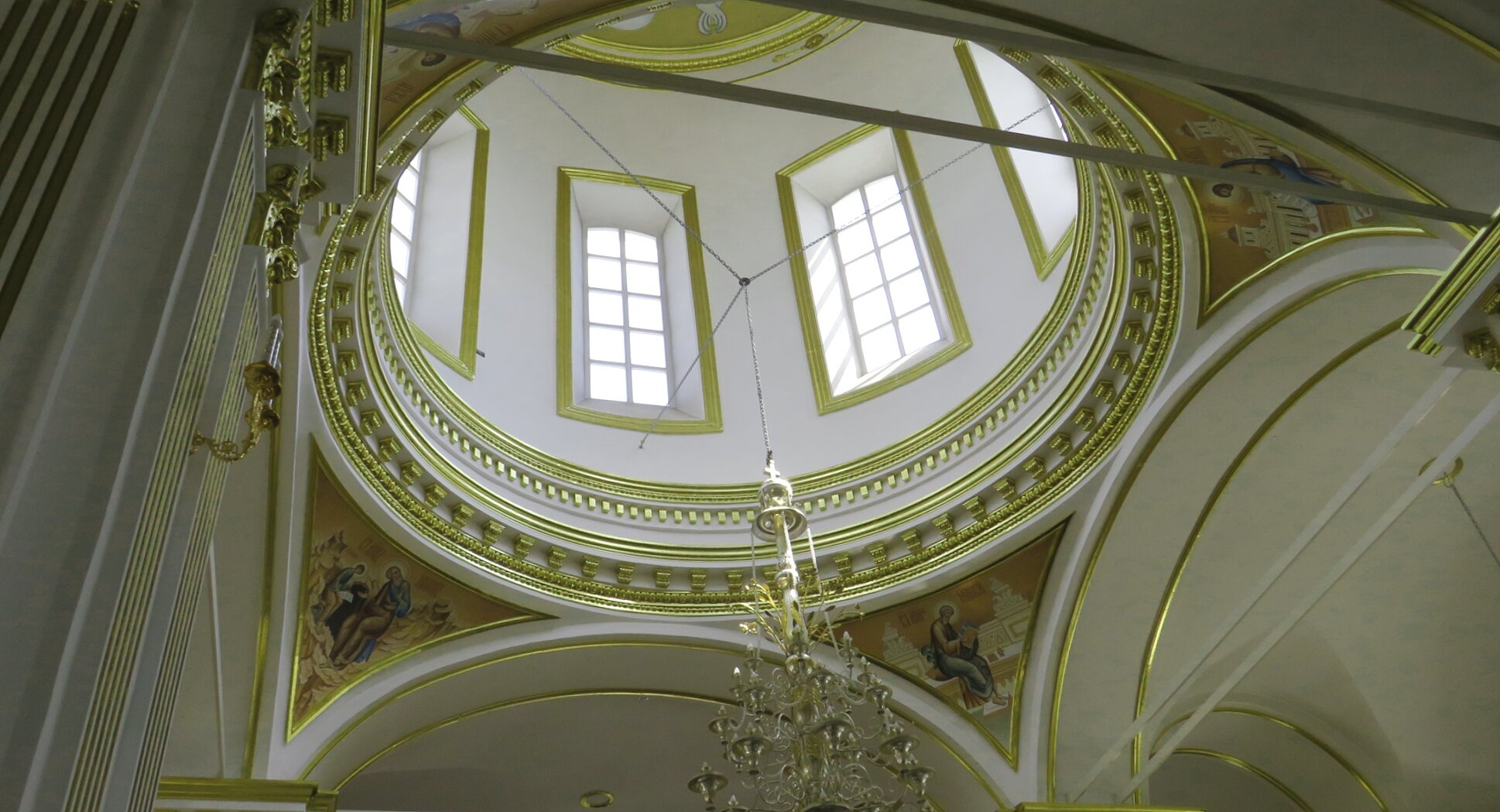 На представленной фотографии запечатлён величественный интерьер кафедрального Богоявленского собора, расположенного на территории Костромского кремля. В центре композиции возвышается мощный световой барабан, увенчанный куполом, из окон которого льётся обильный естественный свет, символизирующий Божественное присутствие и озаряющий всё пространство подкупольного пространства.